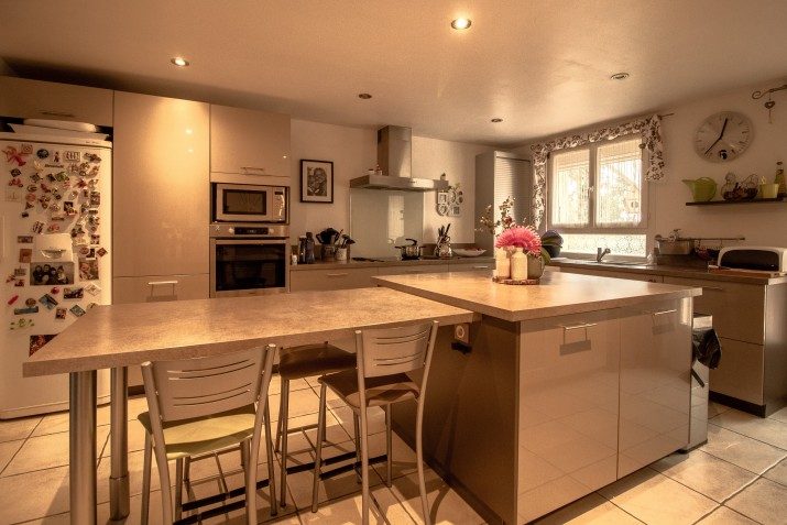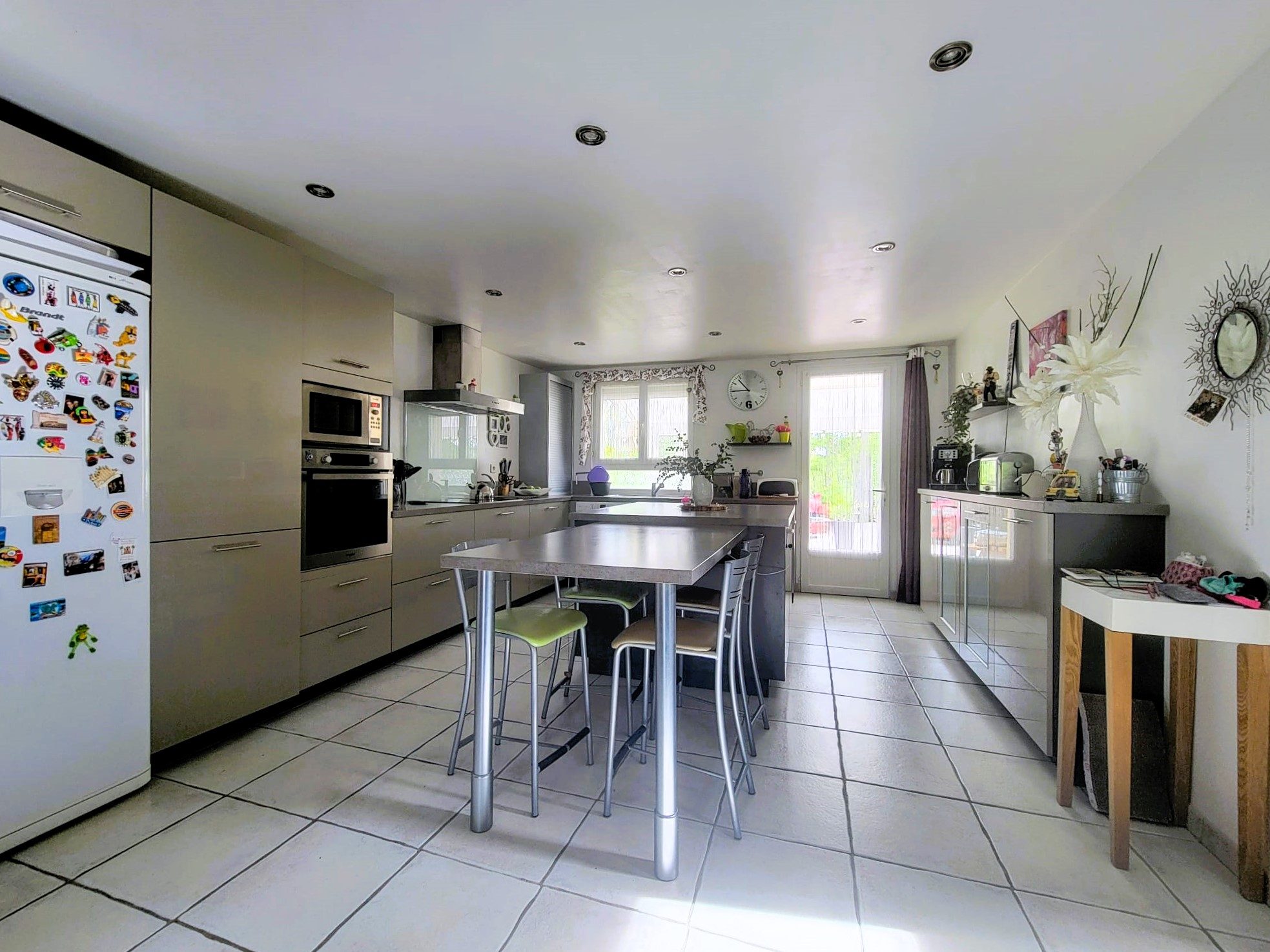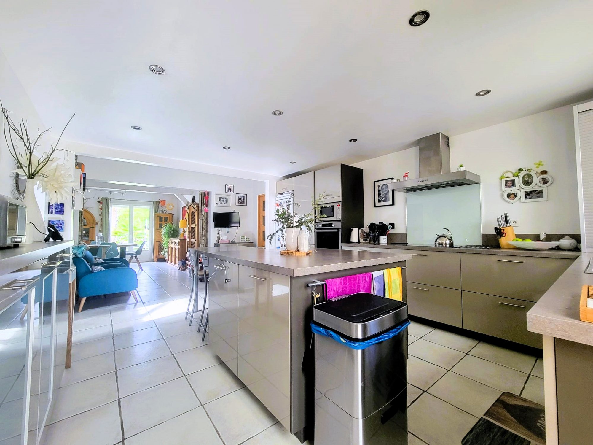 Une spacieuse entrée desservant une grande cuisine moderne et fonctionnelle, ouverte sur l'espace salle à manger.