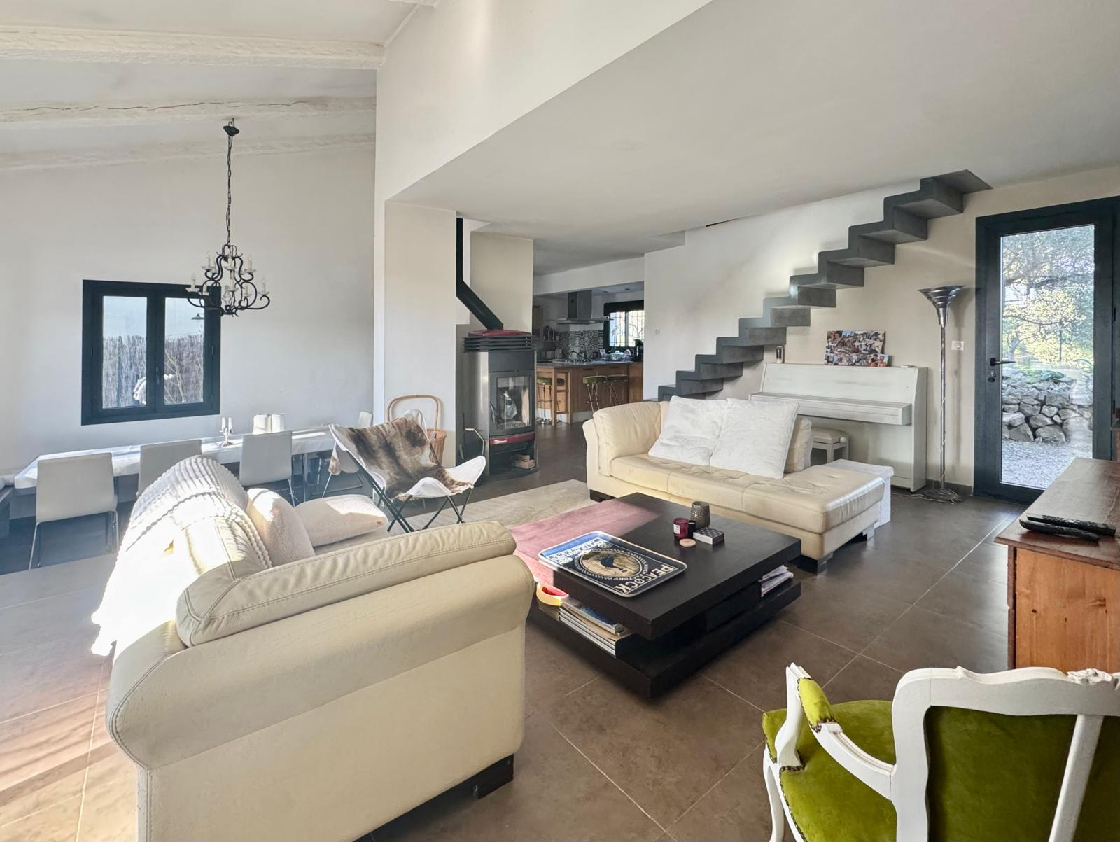 La maison s'ouvre sur un vaste séjour baigné de lumière, prolongé par une belle terrasse et le jardin.