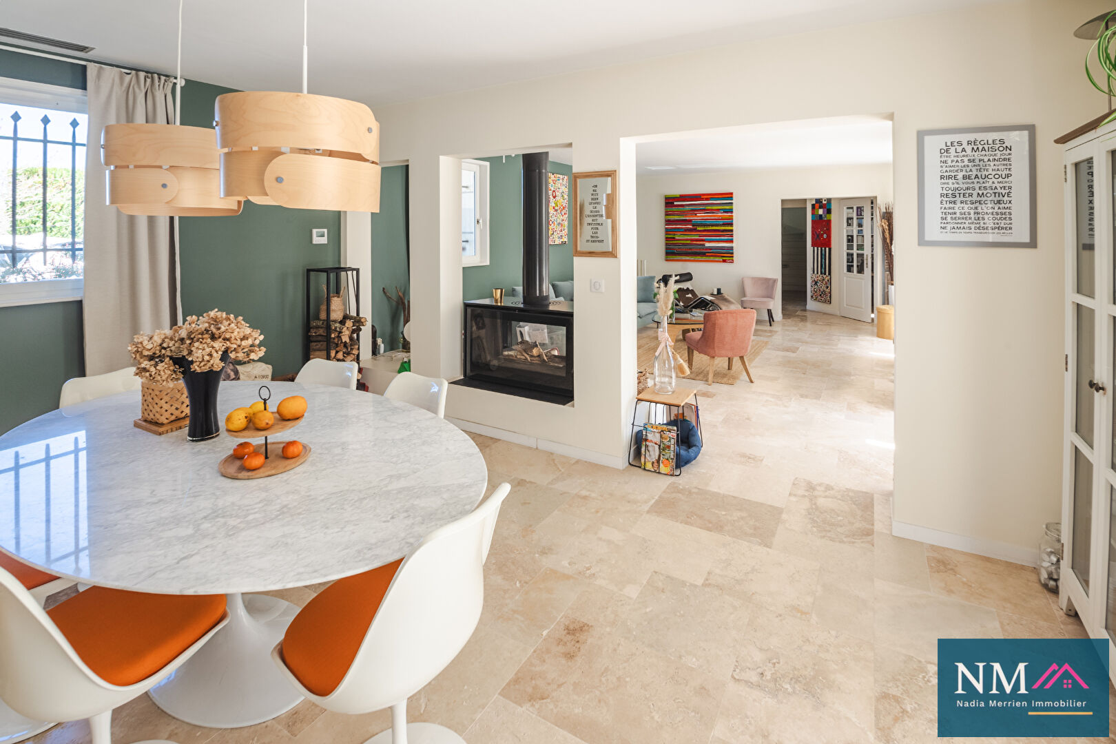 Le Coeur de Vie: Un vaste volume de plain-pied comprenant une pièce de réception lumineuse et traversante avec cheminée, une cuisine dînatoire spacieuse, ainsi que deux bureaux dédiés au télétravail ou autre. Ce pôle central intègre également une buanderie et un accès direct au garage.