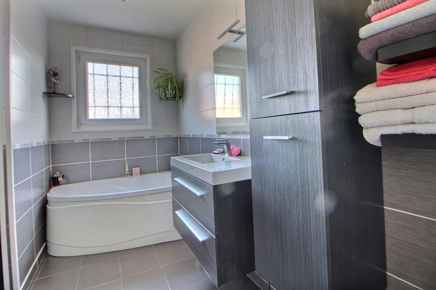Sur le même niveau, s'ensuivent 3 chambres et une salle de bains ( avec douche et baignoire), et WC;
