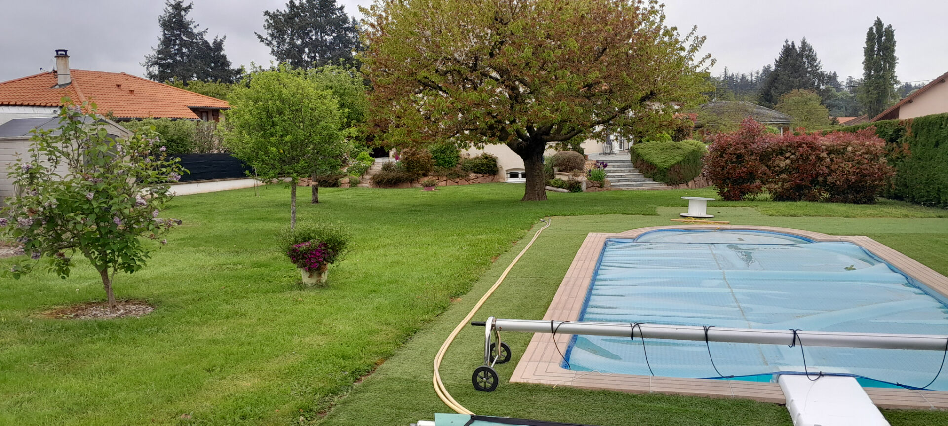 Côté jardin, rien ne manque, même pas la piscine et les massifs fleuris.