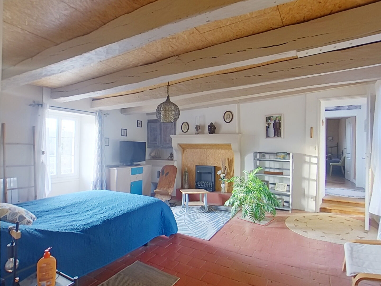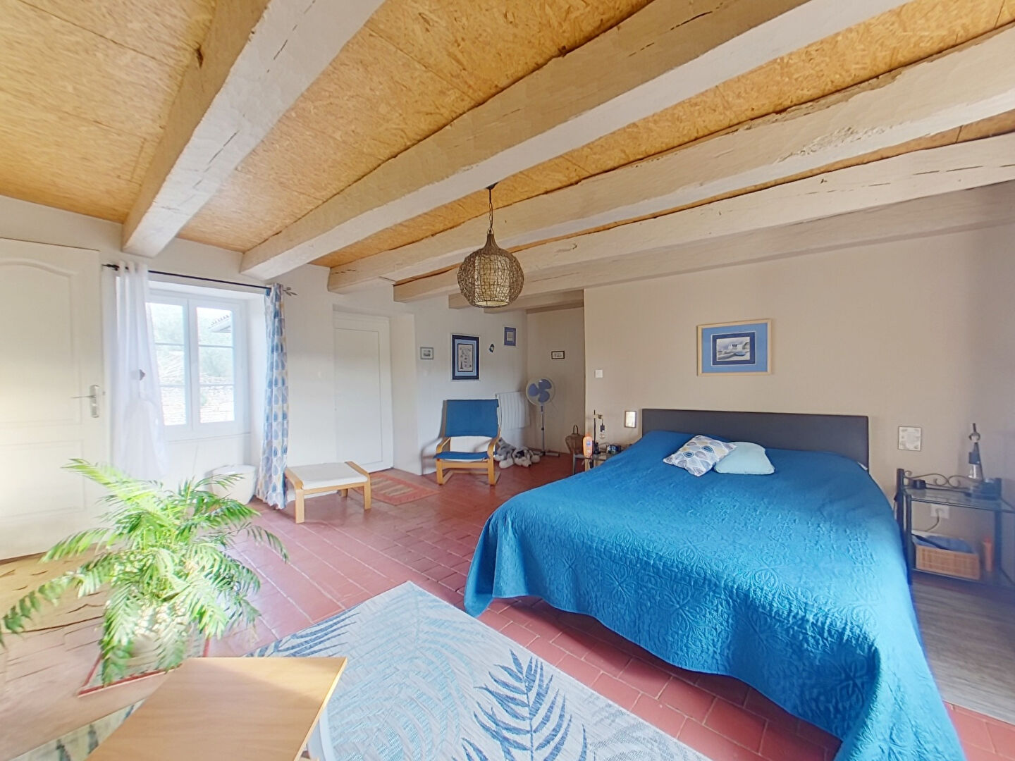 À l'étage, un palier dessert trois chambres, dont une grande chambre de 30 m² offrant un accès direct à une terrasse située à l'arrière de la maison. Cet espace extérieur dispose de plusieurs dépendances, d'une cave d'une surface équivalente à la chambre, ainsi que d'une partie pouvant être aménagée selon vos besoins.