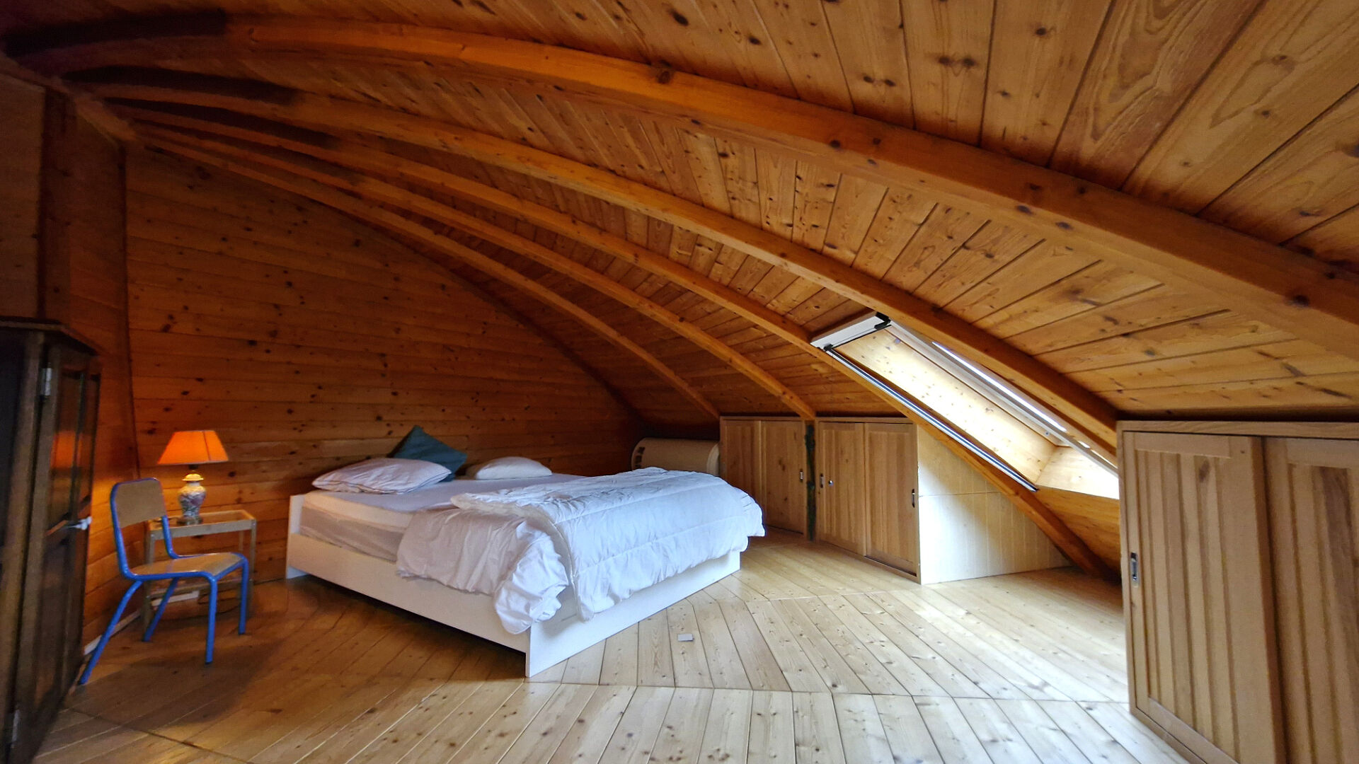 À l'étage, une seconde chambre cosy offre un vrai espace de retrait. Le chauffage au poêle à bois complète le tableau : sobre, efficace, agréable.