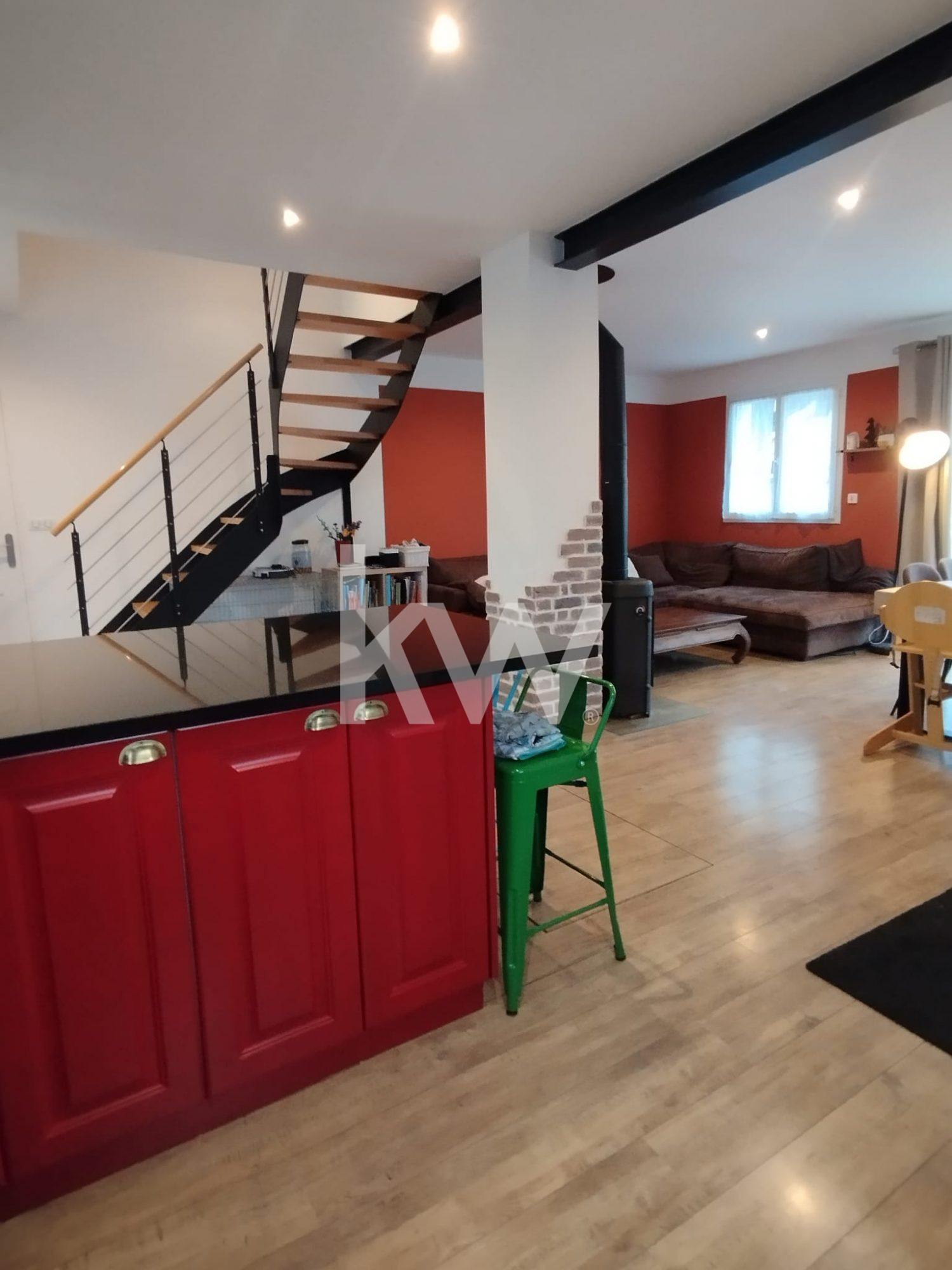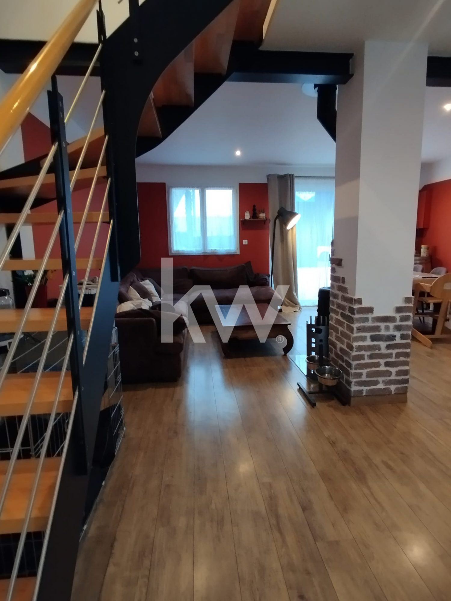 D'une surface d'environ 73 m², la maison s'ouvre au rez-de-chaussée sur une pièce de vie agréable et lumineuse, comprenant un salon-séjour avec cuisine ouverte, aménagée et partiellement équipée.