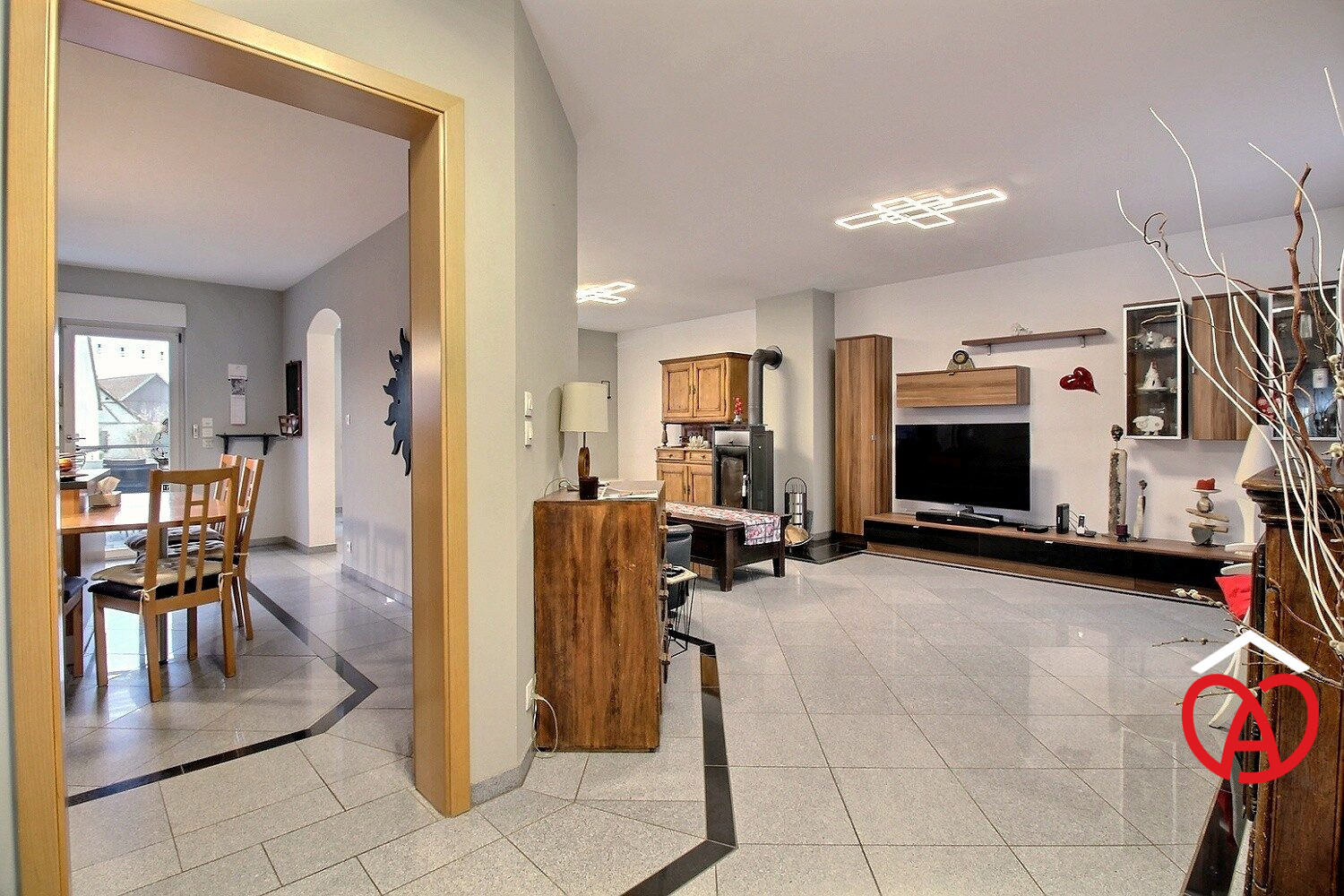 - Une grande pièce de vie salon/salle-à-manger de 40m² avec poele à bois
