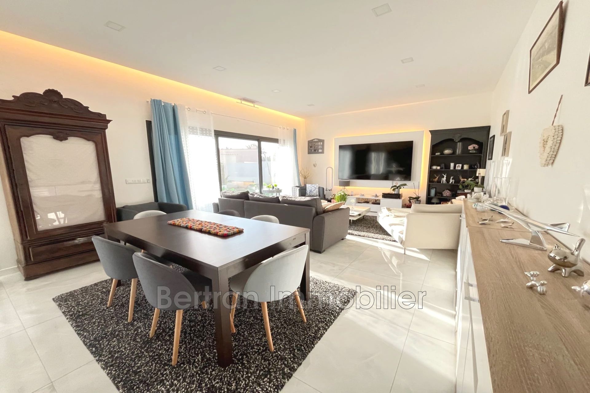 À quelques minutes de Perpignan et des plages, elle séduit par ses beaux volumes et son espace de vie lumineux ouvert sur l'extérieur.