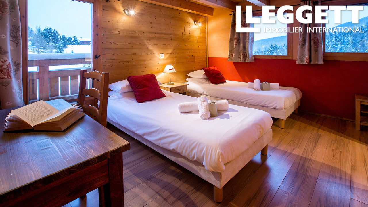 Chaque chambre dispose d'une salle de bain privative avec WC, deux au rez-de-chaussée et trois à l'étage. Le dernier étage abrite un superbe espace de vie : un salon-cuisine-salle à manger ouvert avec cheminée et une vue parmi les plus belles du massif du Mont Blanc qu'offre La Plagne.