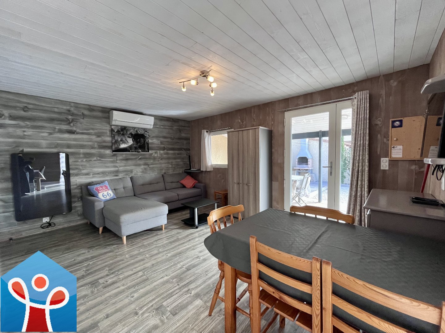Le séjour s'ouvre sur une terrasse couverte, donnant elle-même sur une terrasse en bois exotique exposée sud avec espace barbecue.