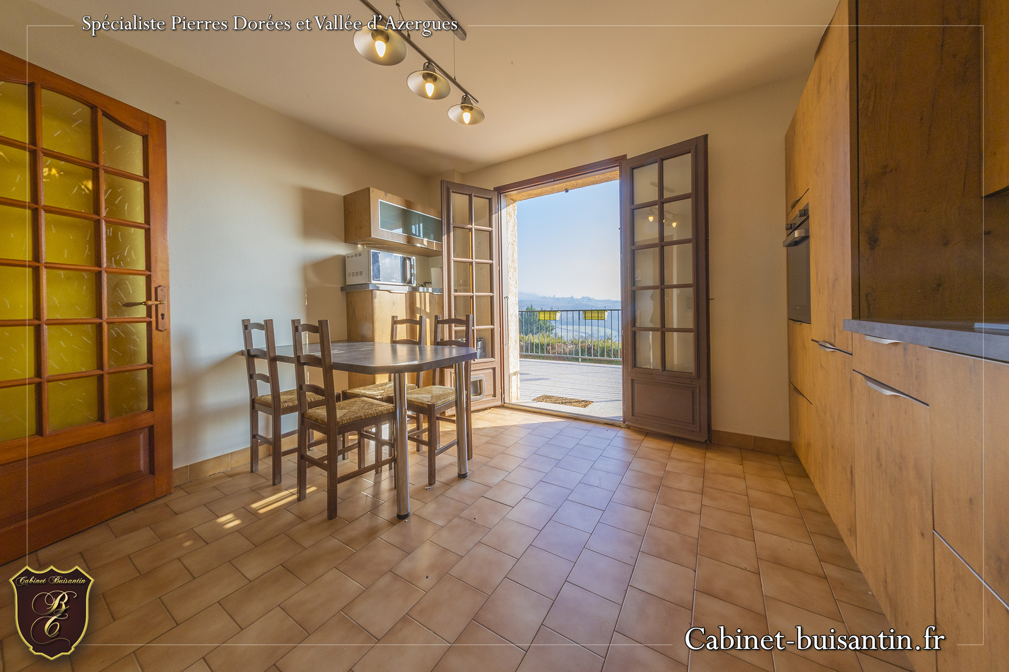 LE BOIS D'OINGT - Située dans un environnement privilégié avec vue imprenable, à 2 minutes du centre village, avec accès à pied aux commerces et commodités. Villa traditionnelle construite sur sous-sol complet d'environ 114 m2 habitables. Elle comprend: un vaste séjour-salon avec poêle à granulés donnant sur terrasse suspendue bénéficiant d'une vue imprenable sur les collines et vignobles, cuisine équipée, suite parentale avec salle d'eau privative, wc. A l'étage, 3 chambres, salle de bains et wc. Un sous-sol d'environ 70 m2 pouvant être aménagé complète ce bien. Le tout sur un terrain clos et joliment arboré de 1 170 m2.