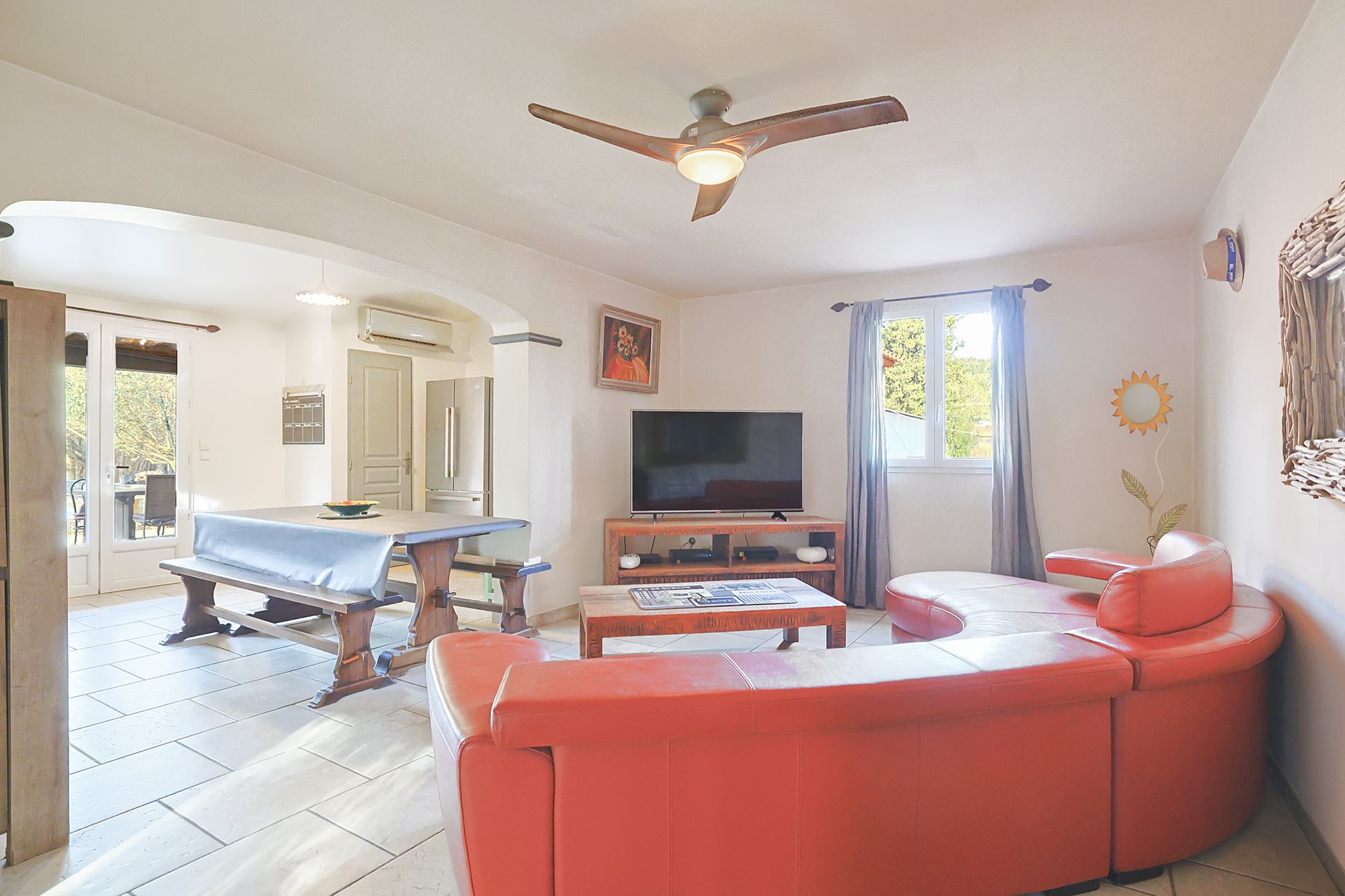 À l'intérieur : Une pièce de vie de 40m2 avec séjour, salle à manger et cuisine, l'ensemble donnant sur une terrasse.