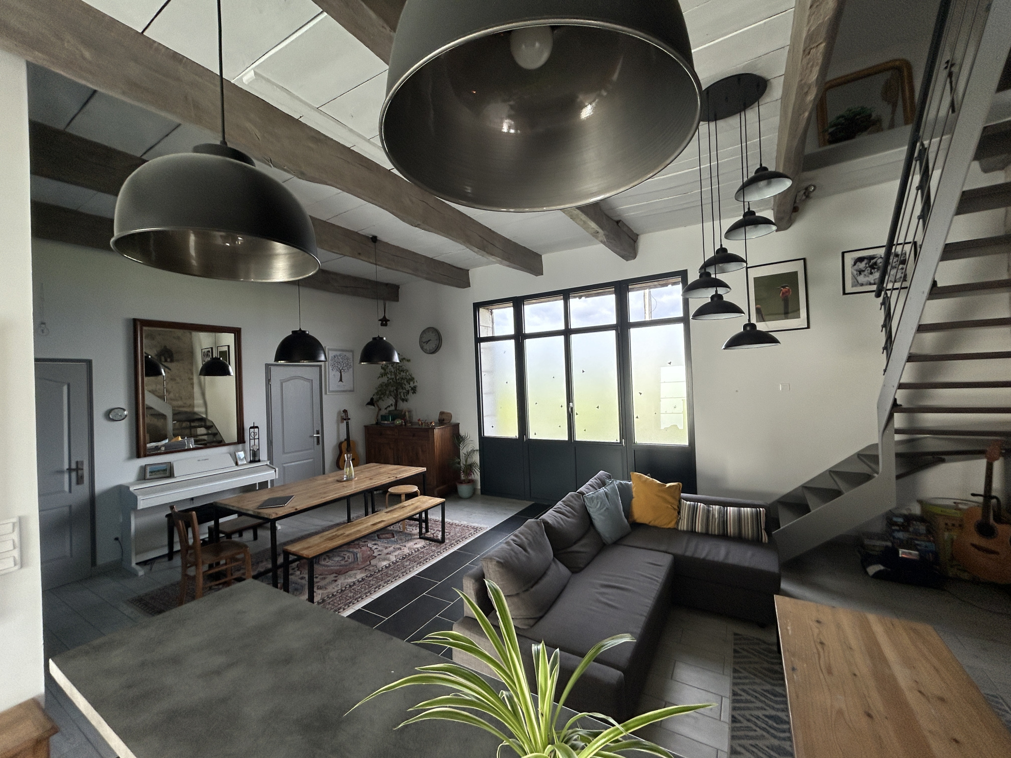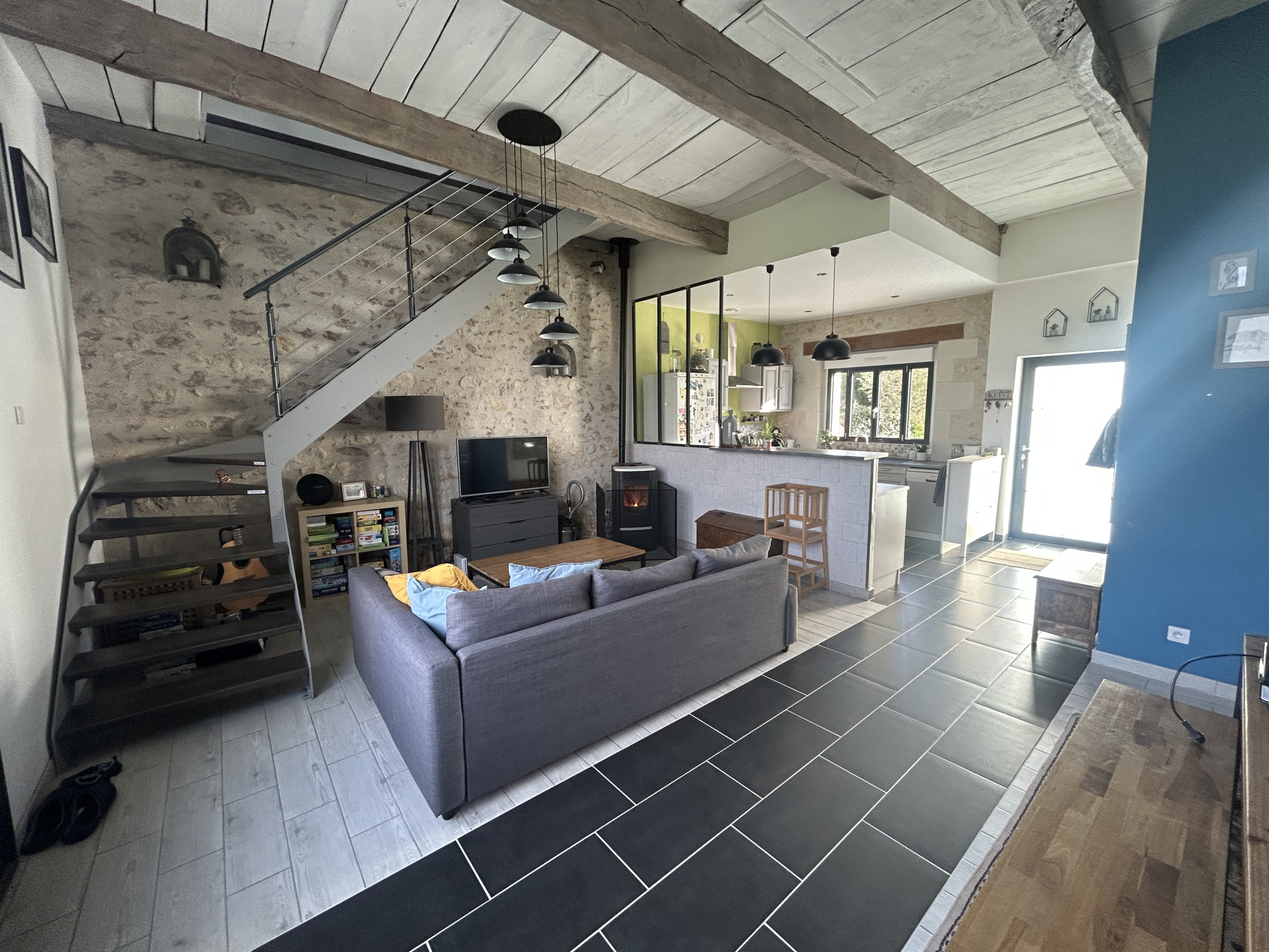 Belle pièce de vie de 50 m2, chaleureuse et conviviale, équipée d'un poêle à granulés, avec cuisine ouverte