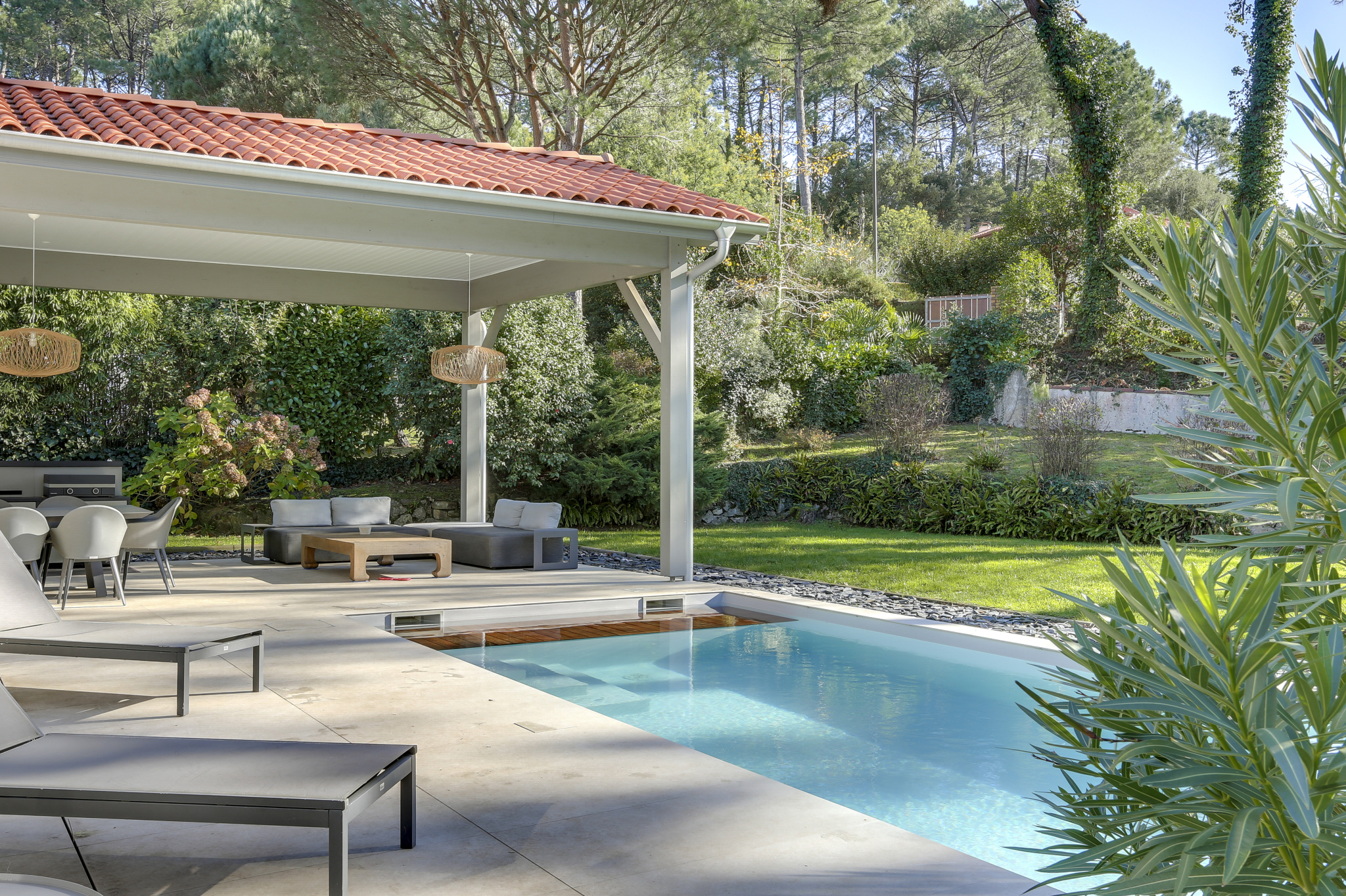 À l'extérieur, une grande terrasse couverte avec cuisine d'été accompagne la piscine dans un environnement boisé et tranquille. Un garage fermé vient parfaire les prestations.