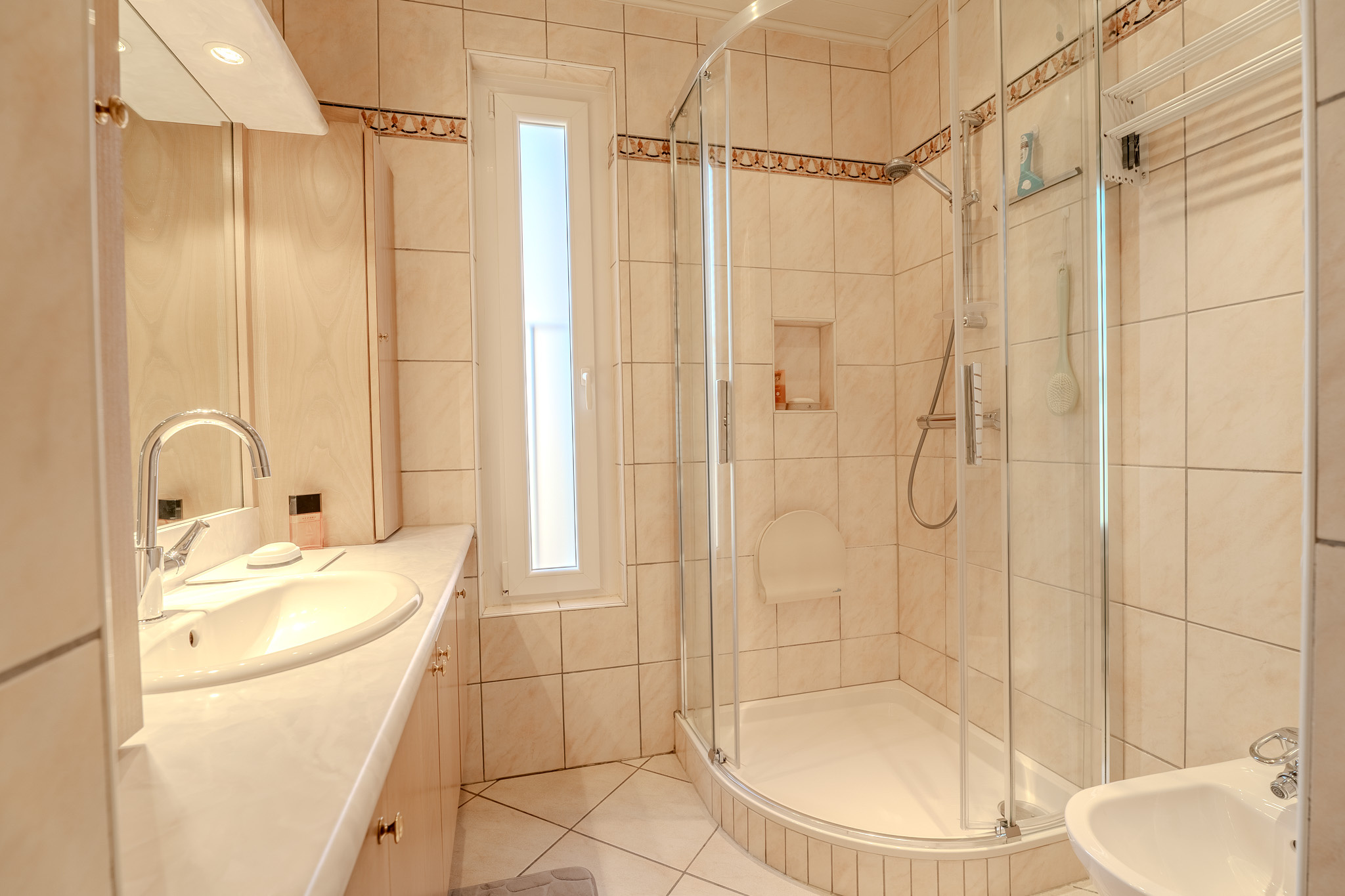 Salle d'eau avec douche d'angle et chauffage au sol