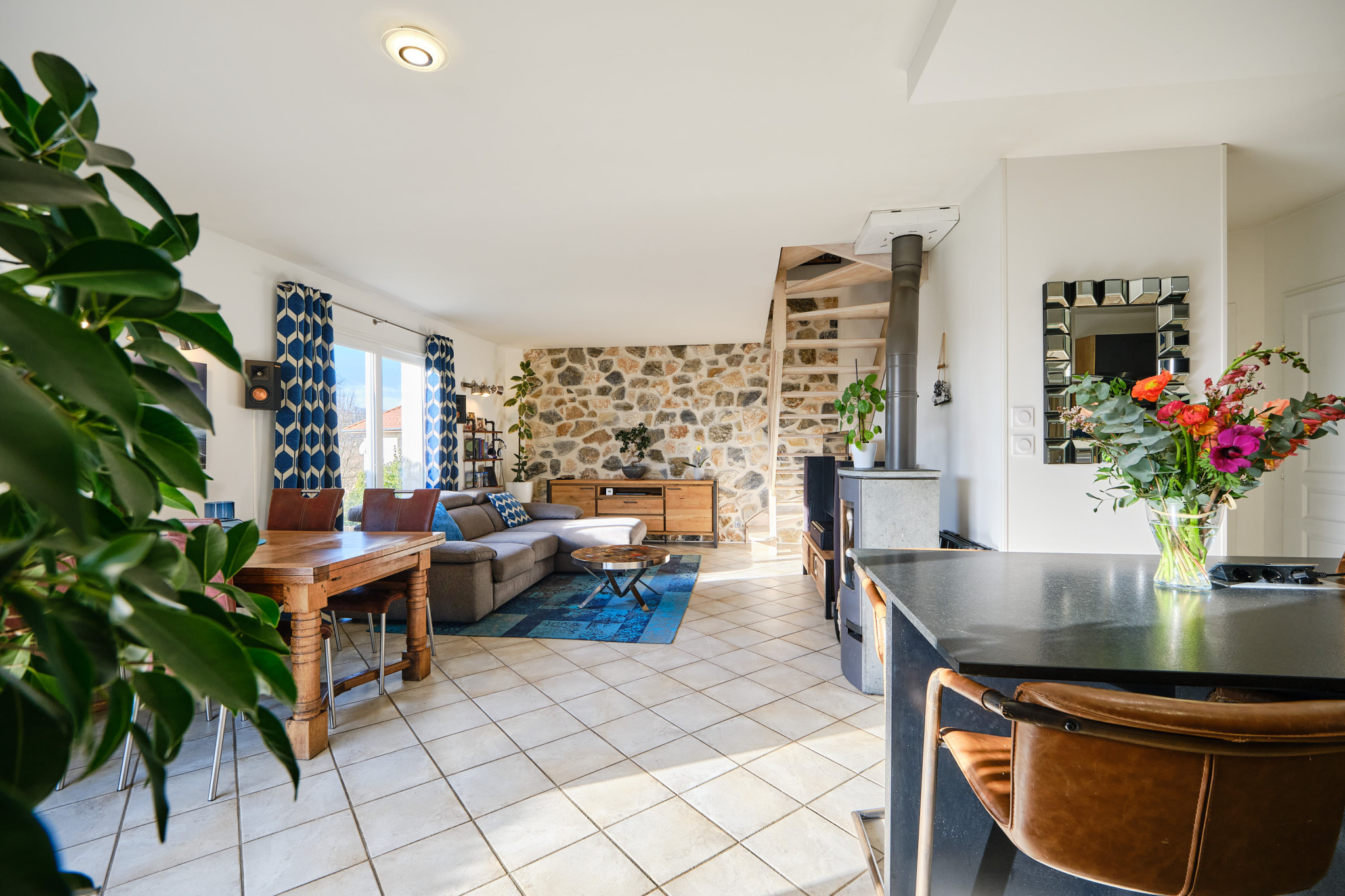 Au rez-de-chaussée, vous trouverez un séjour chaleureux de 30m2 avec poêle à bois. Un mur en pierre apporte une touche d'authenticité à l'ensemble.