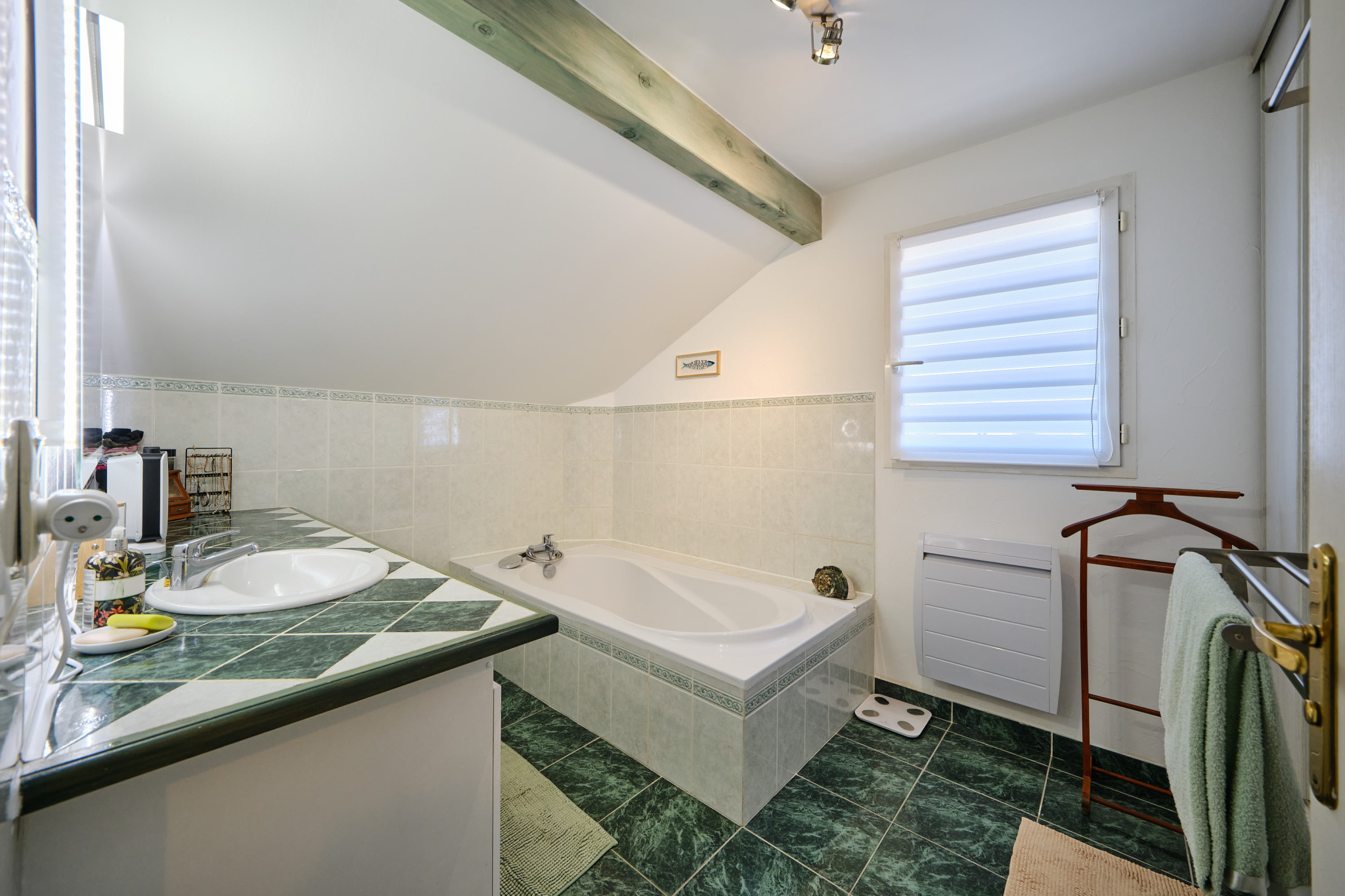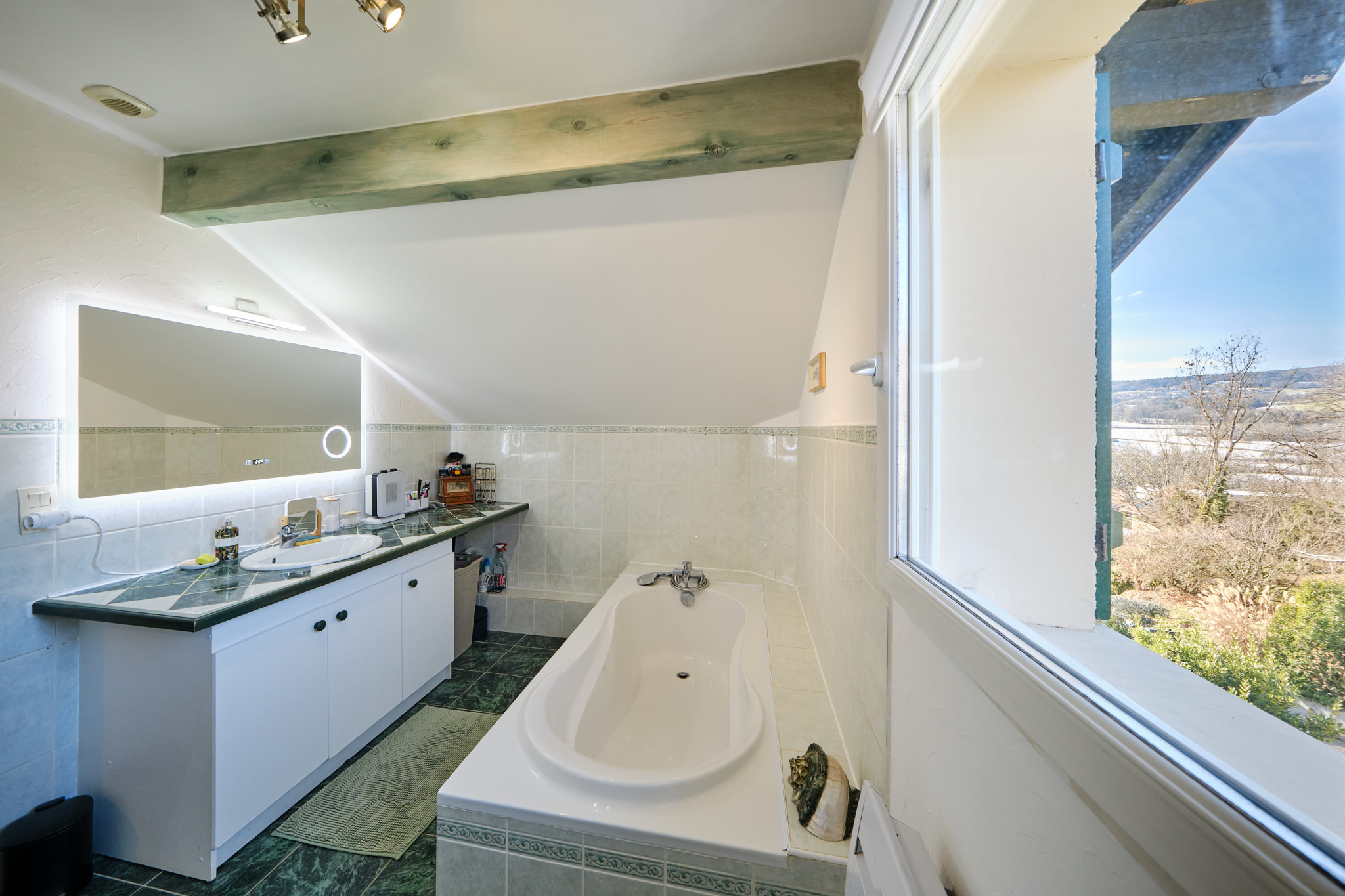 La grande salle de bain de 7m2 bénéficie d'une ventilation naturelle grâce à une fenêtre donnant sur le jardin.