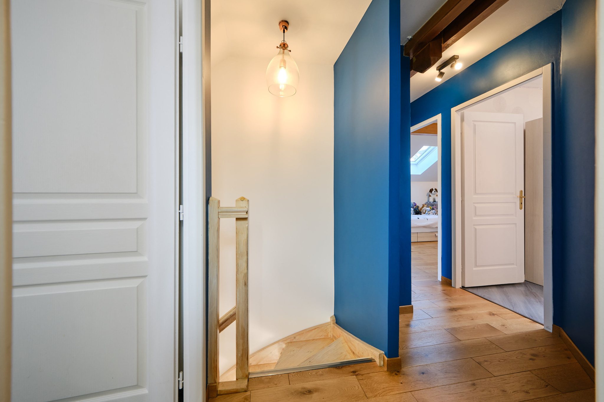 Un escalier en bois vous conduira à l'étage où vous trouverez deux chambres, dont une avec balcon, et un bureau pouvant faire office de chambre d'enfant ou d'espace de détente.