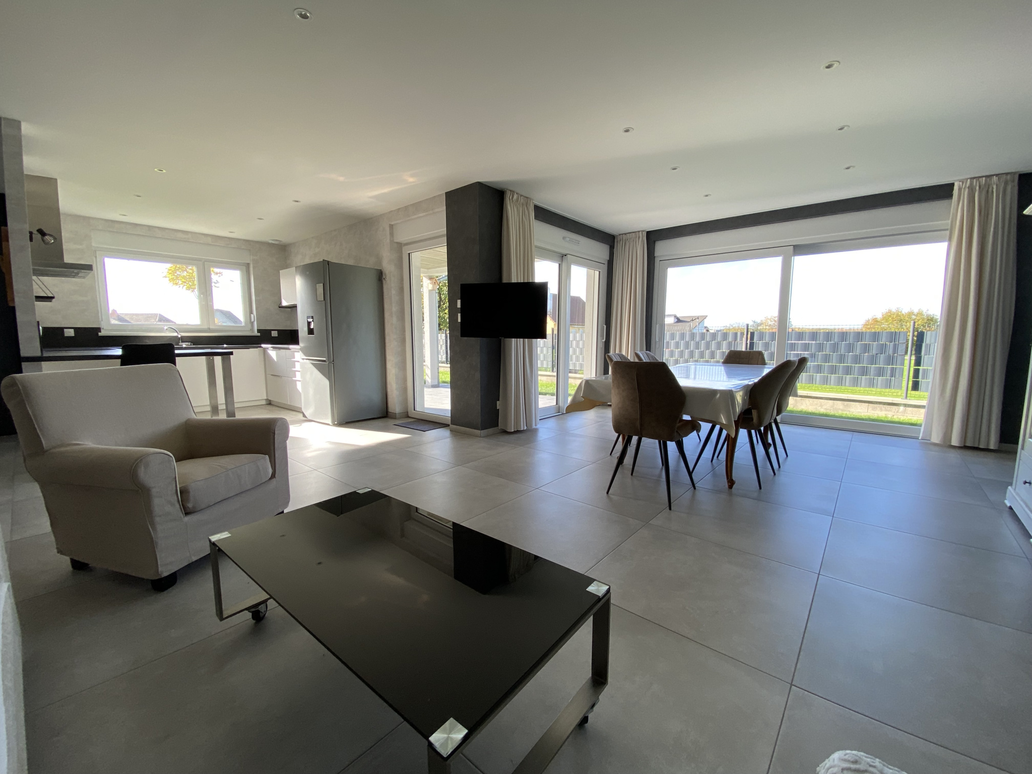 Une vaste pièce de vie : grand salon-séjour ensoleillés, baignés de lumière grâce à de larges ouvertures donnant sur terrasse.