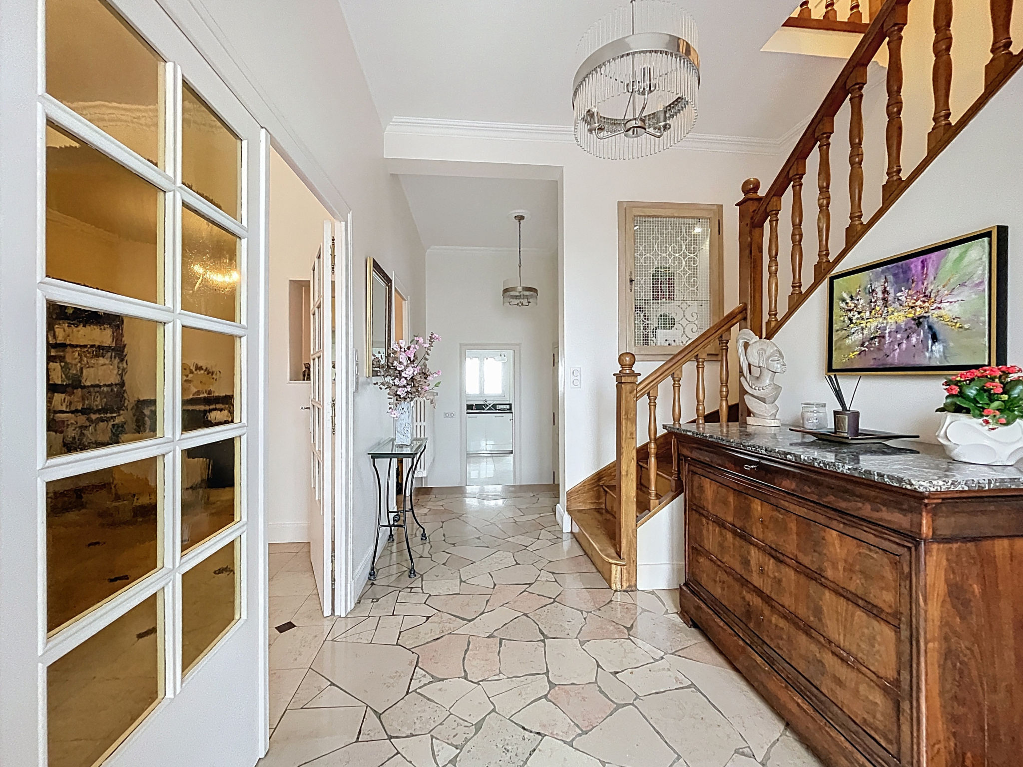 Au rez-de-chaussée, vous trouverez une grande entrée, une belle pièce de vie lumineuse avec parquet, moulures et cheminée, une cuisine indépendante équipée avec accès à la terrasse, une salle à manger, un salon, un bureau ainsi qu'un WC avec lave-mains