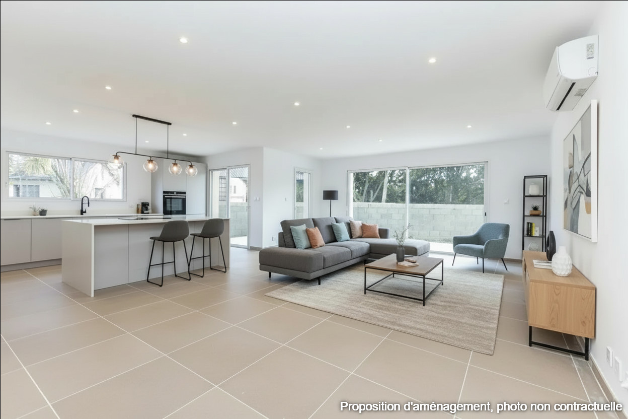 L'espace prévu pour l'aménagement de la cuisine est ouvert sur le séjour (projet sur option pouvant être prévu sur demande).