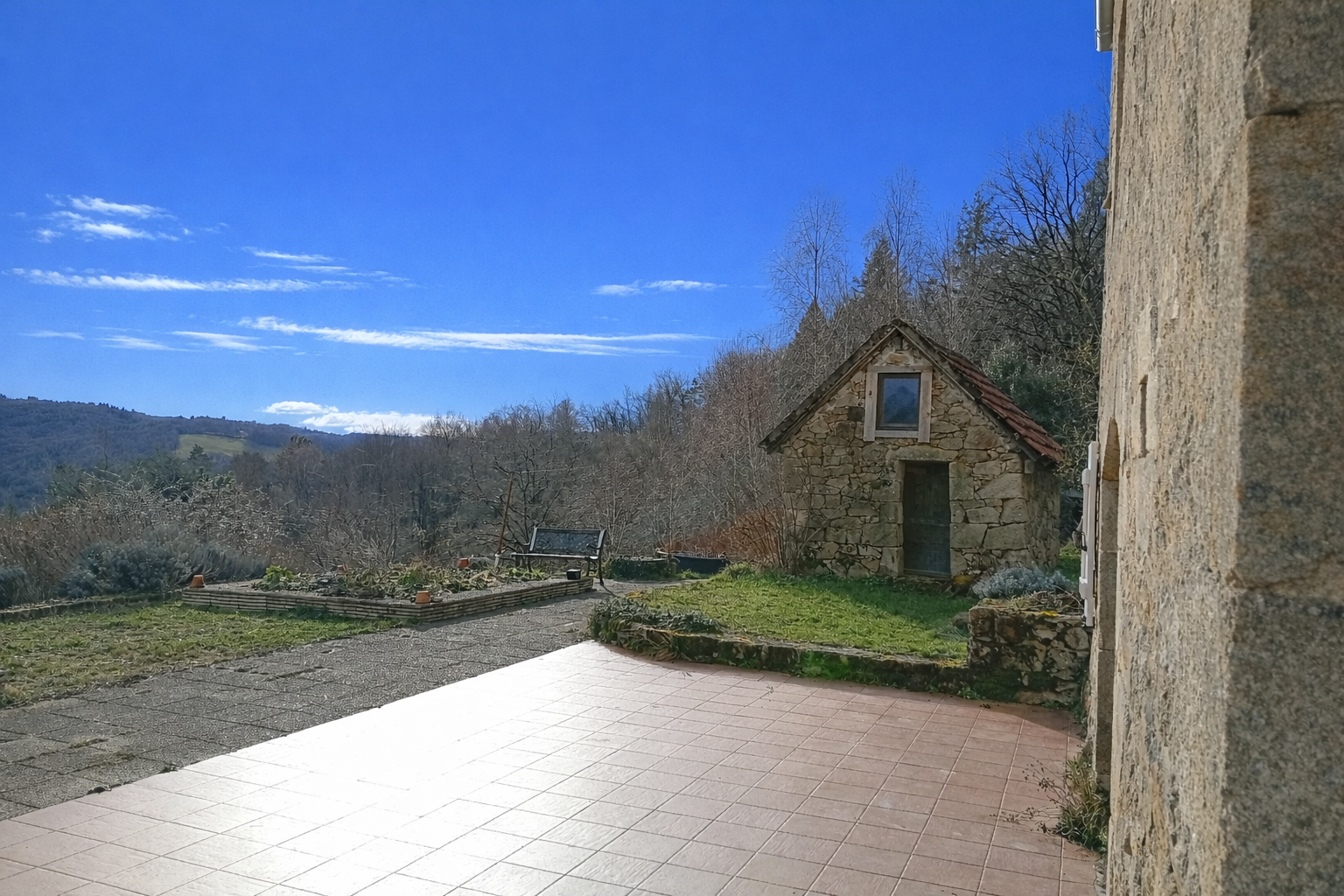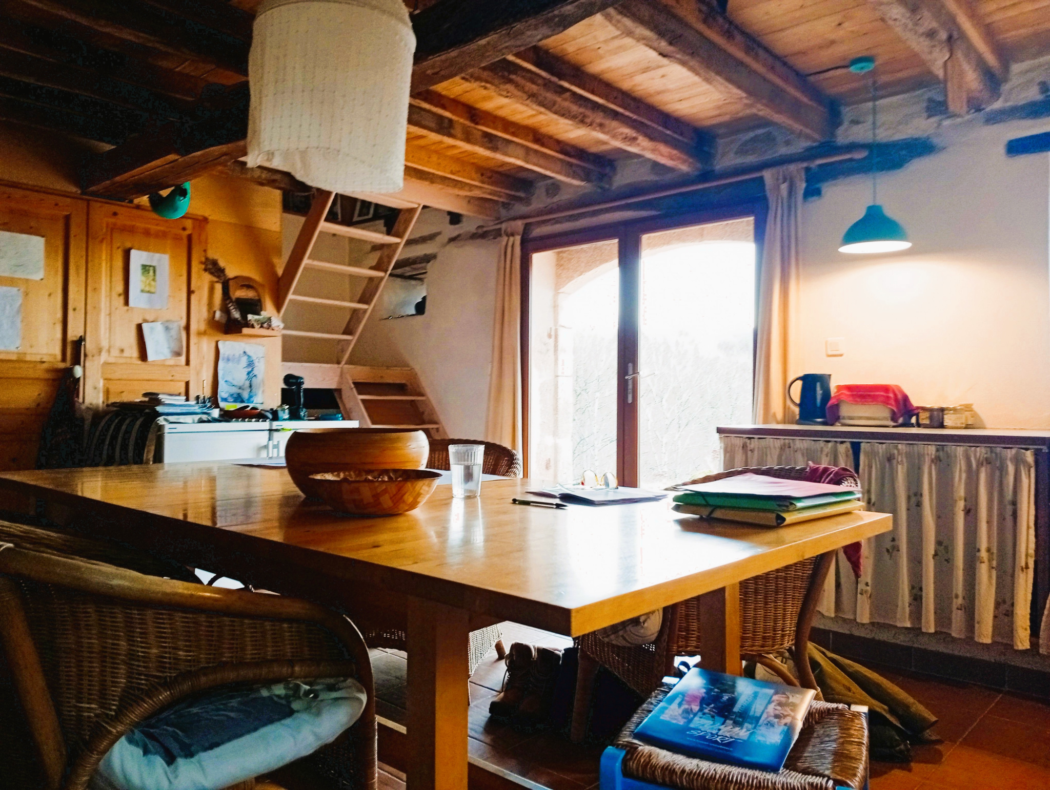 La maison principale (env. 88 m2) est répartie sur trois niveaux, dont deux sont directement accessibles de plain-pied grâce à son implantation contre la colline.Par la terrasse, on accède à la cuisine-salle à manger chaleureuse, équipée d'un poêle à bois et offrant une très belle vue.
