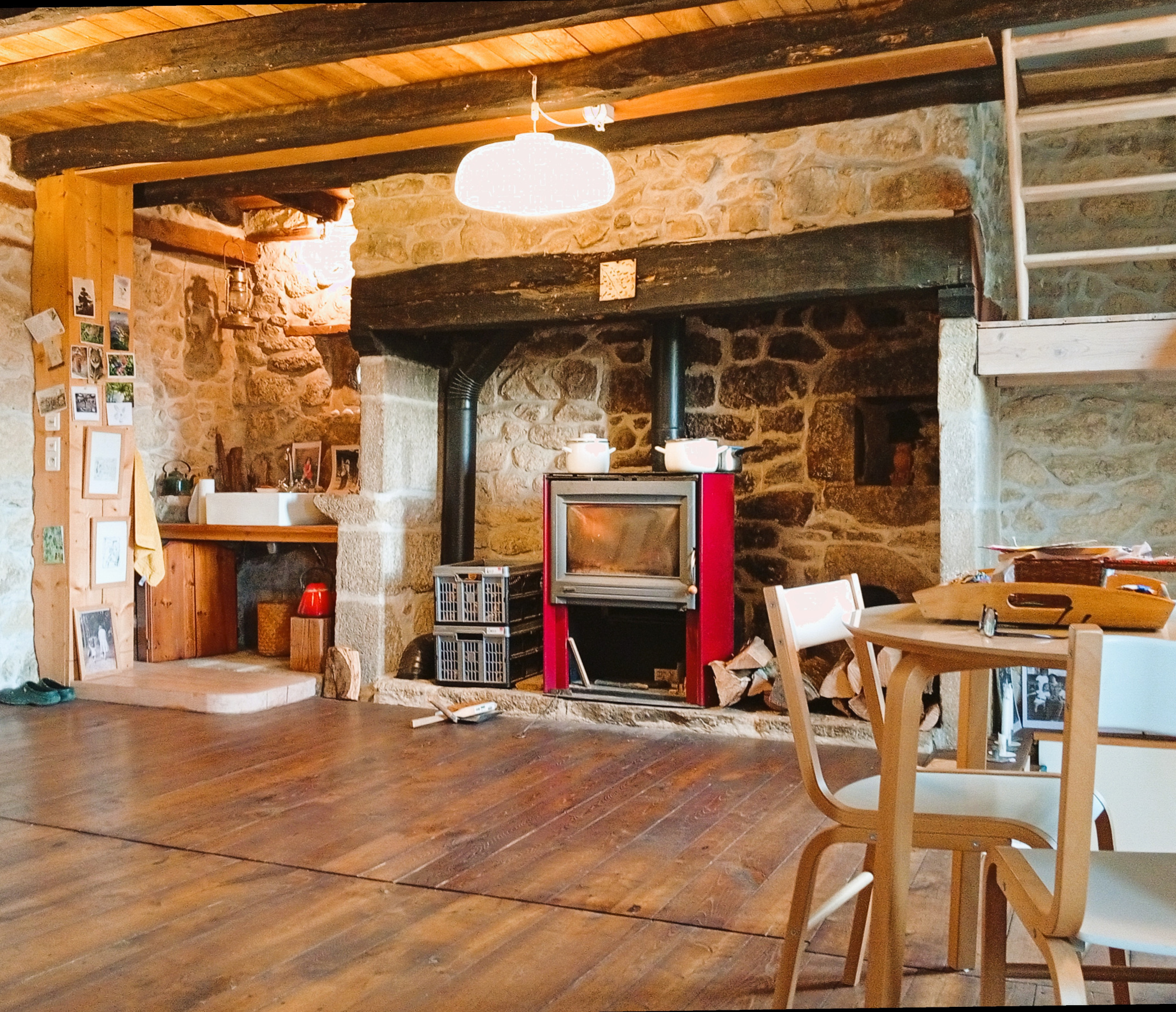 La seconde partie a été entièrement aménagée en habitation indépendante (env. 85 m2), idéale comme gîte ou logement pour invités. Elle comprend une grande pièce de vie ouverte avec cuisine et un poêle à bois (env. 60 m2).