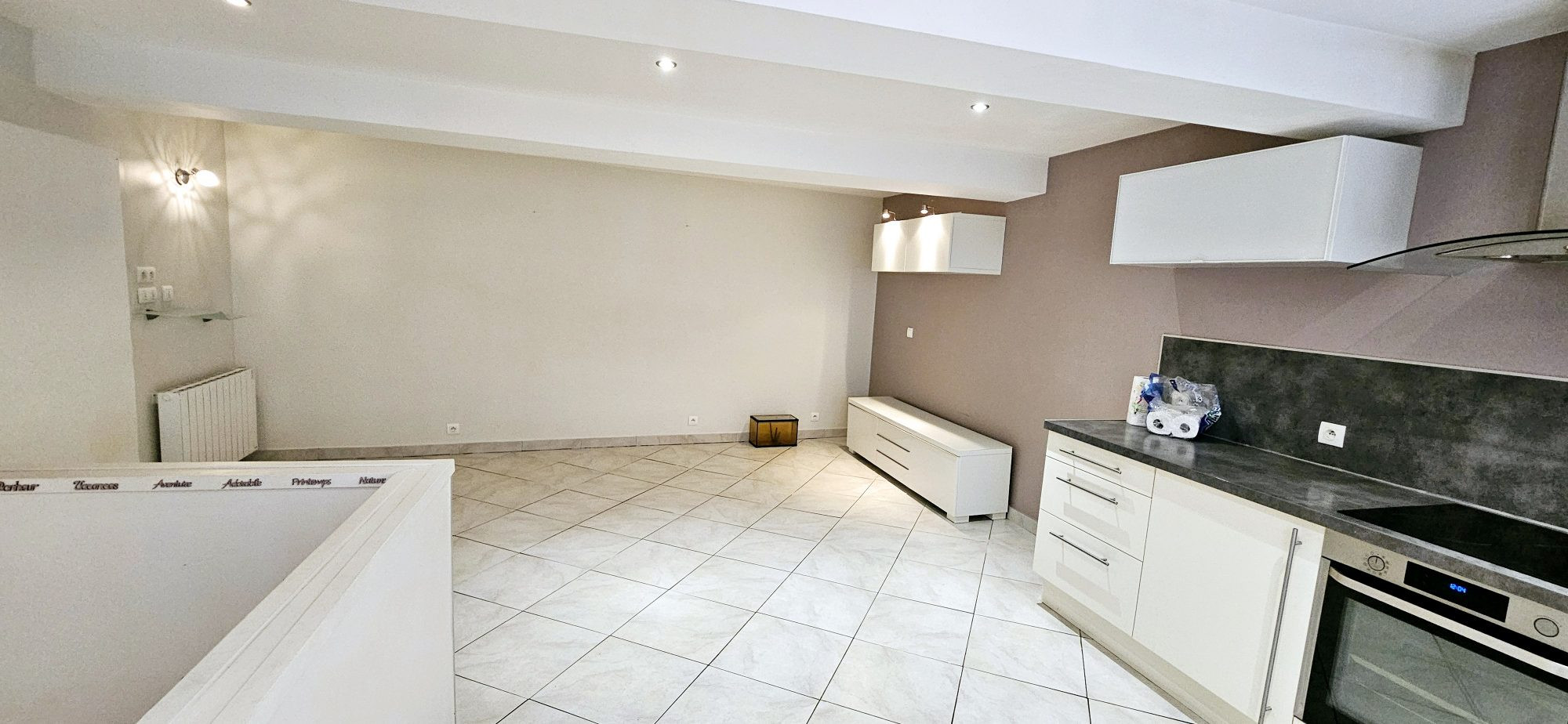 Au 1er étage, un spacieux séjour vous attend avec une cuisine ouverte, aménagée et équipée (four, plaque de cuisson et hotte), idéale pour partager des moments conviviaux.