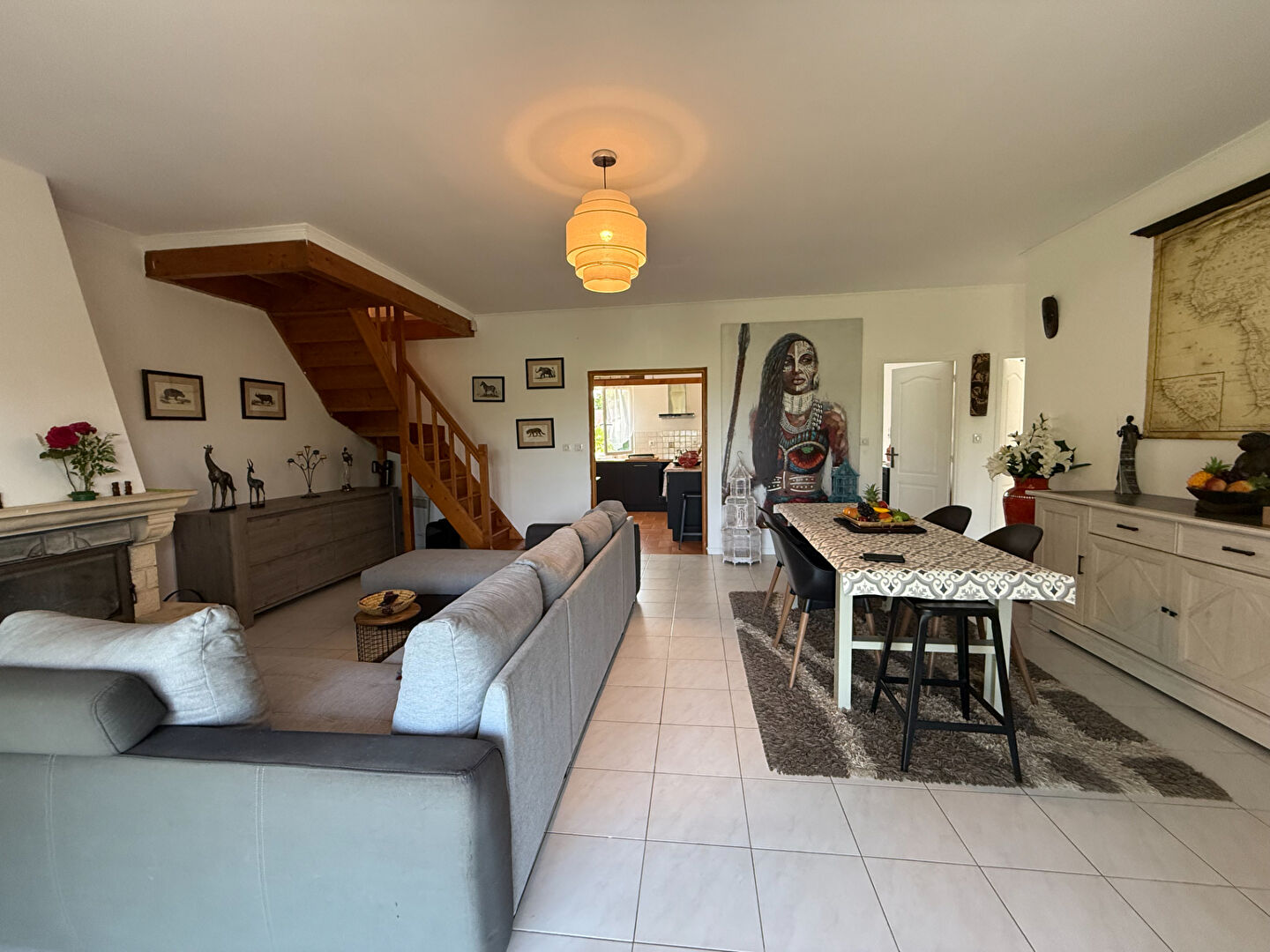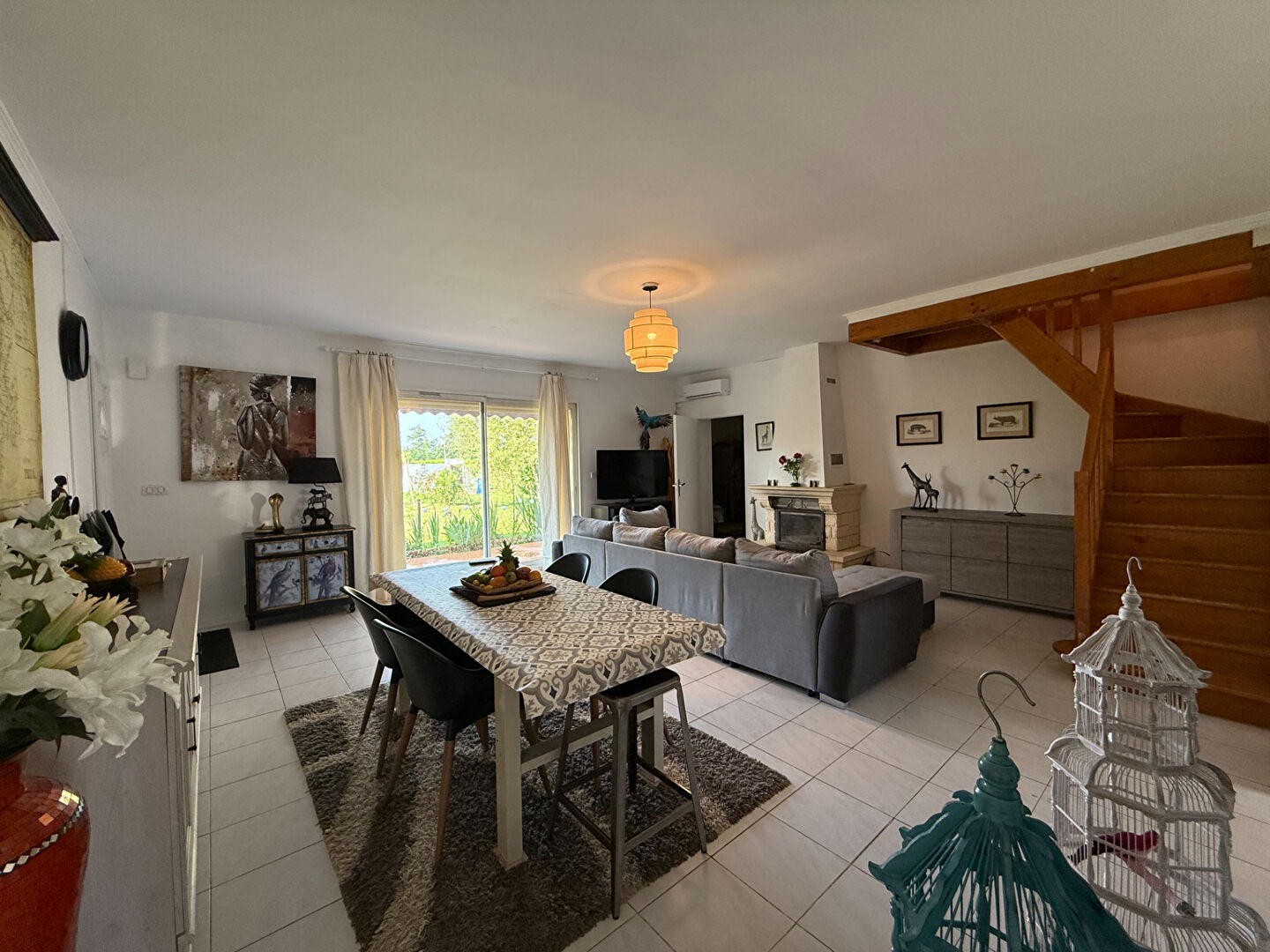 La maison se compose au rez-de chaussée, d'une pièce de vie lumineuse, climatisée avec une cheminée, d'une cuisine,
