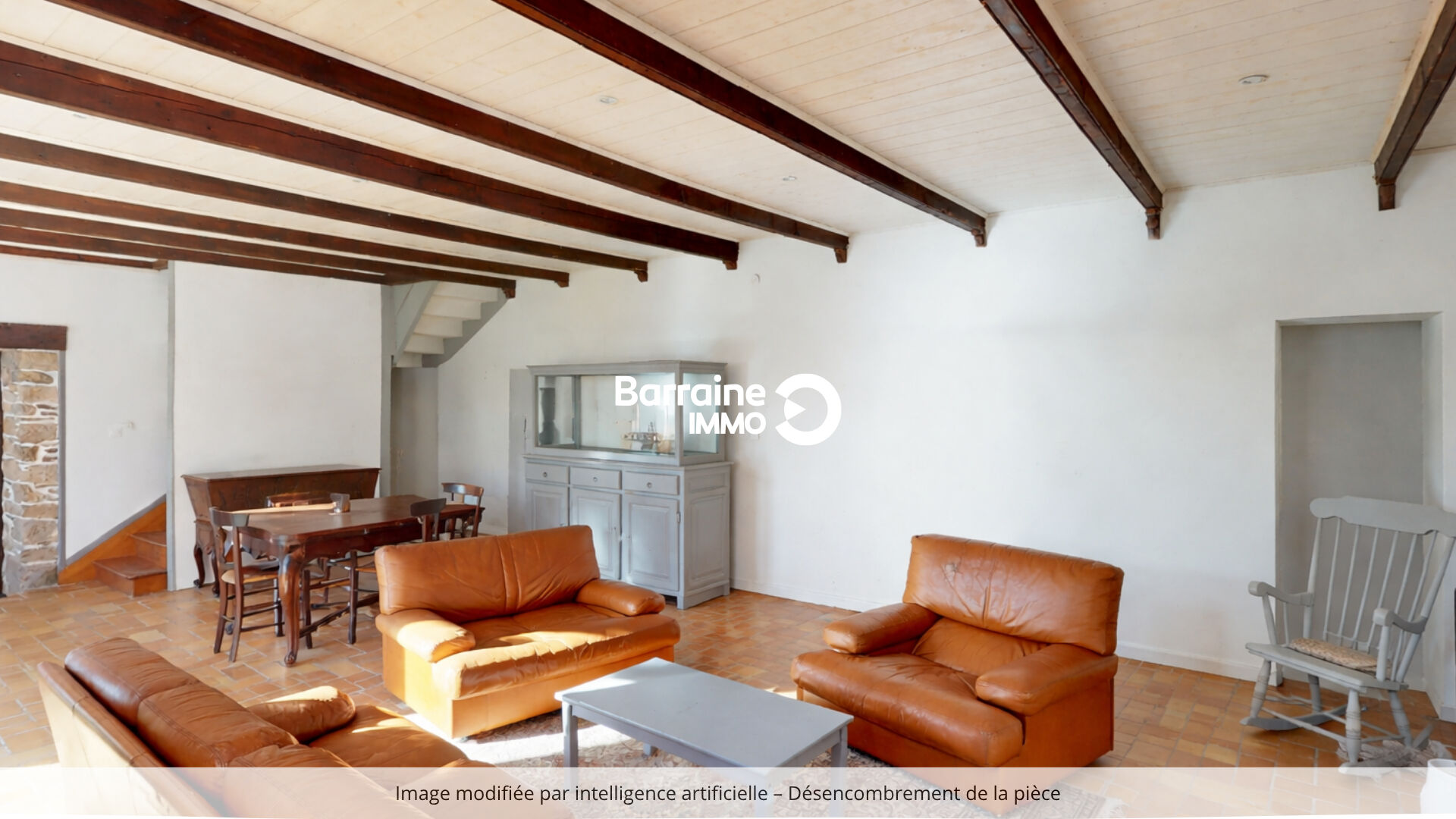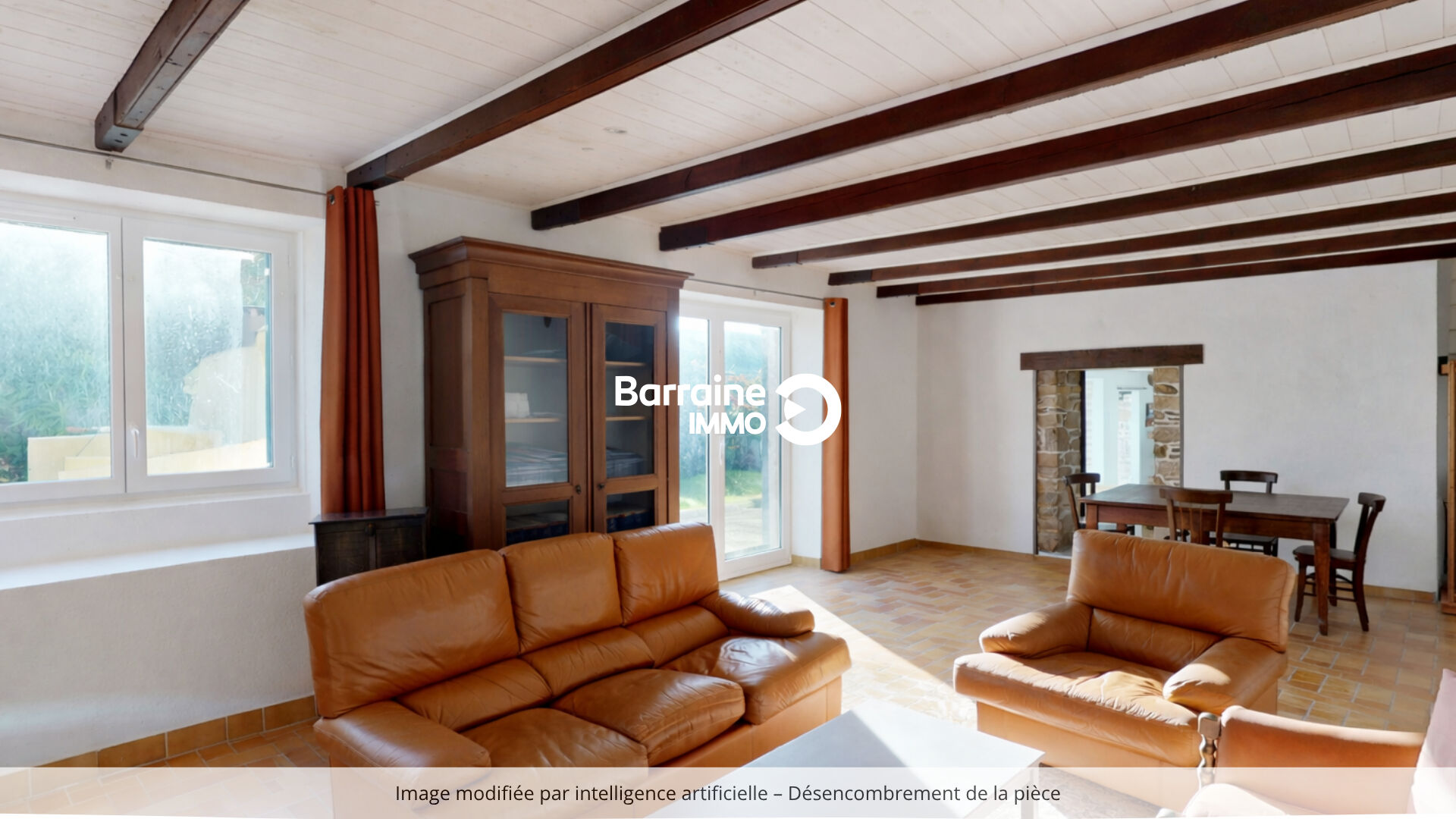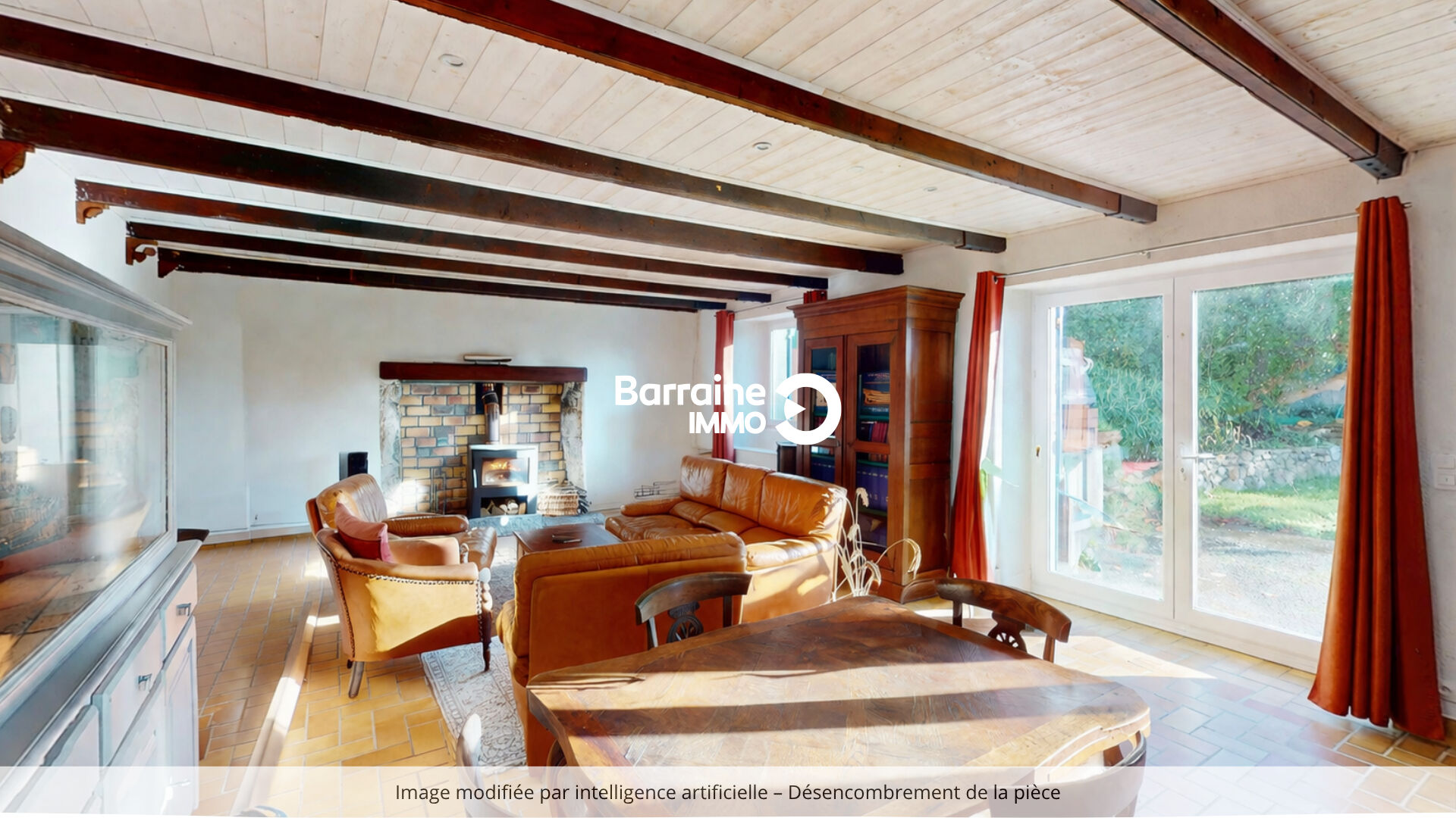 La seconde partie de la longère prolonge harmonieusement la première, avec un séjour chaleureux doté d'une cheminée restaurée dans son emplacement d'origine.