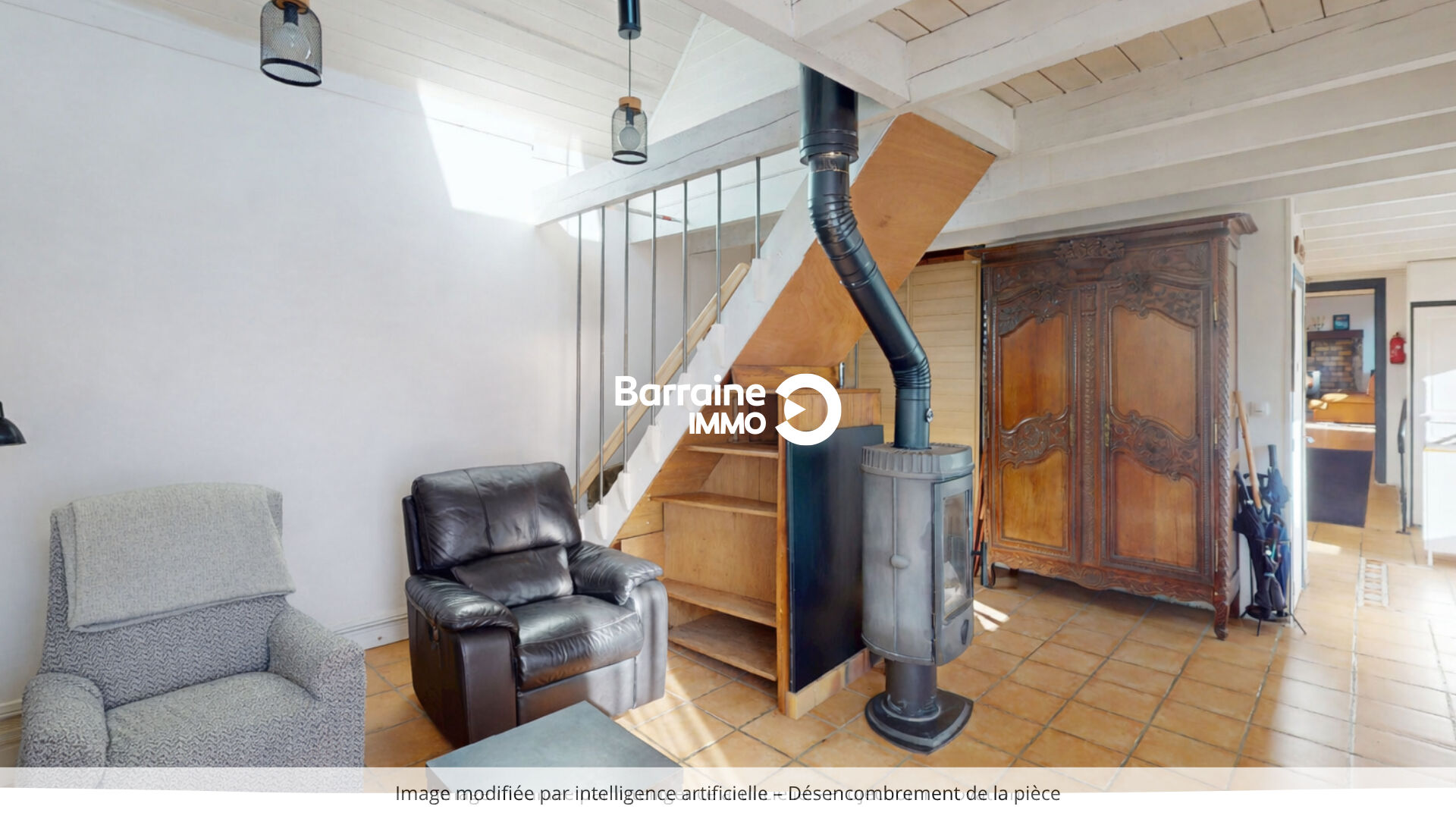 La première partie s'ouvre sur un vaste séjour agrémenté d'un poêle à bois, créant une atmosphère conviviale. La cuisine aménagée et équipée, attenante, permet une vie quotidienne confortable.