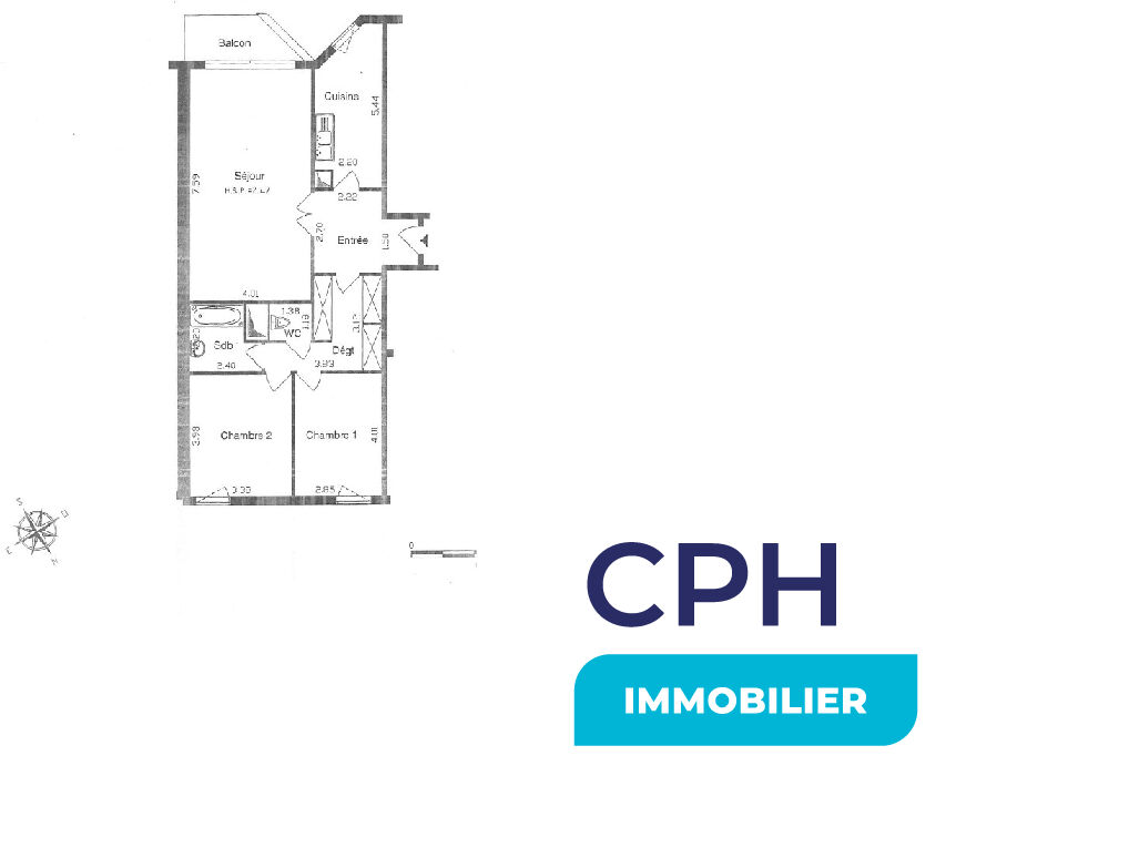 Il se compose d'une entrée, d'une cuisine aménagée et équipée, d'un grand séjour de 30 m², de deux chambres, d'une salle de bains, d'un dégagement avec rangements et d'un wc.