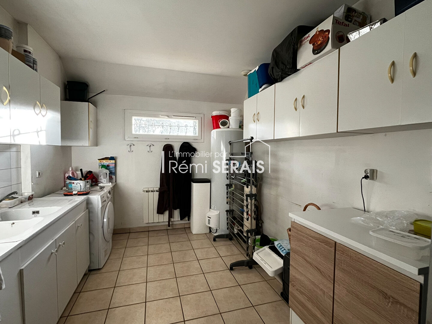 La maison offre au rez-de-chaussée une entrée accueillante, une belle pièce de vie ouverte sur la cuisine aménagée et équipée, un salon cosy, un bureau, une buanderie avec douche, ainsi qu'un garage faisant office de cellier et d'espace de stockage.