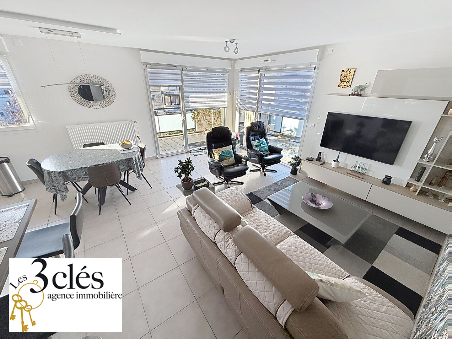 L'appartement offre une belle pièce de vie lumineuse avec cuisine entièrement équipée, ouvrant sur une grande terrasse de 20 m², idéale pour profiter d'un environnement paisible et d'une vue dégagée sur les montagnes.