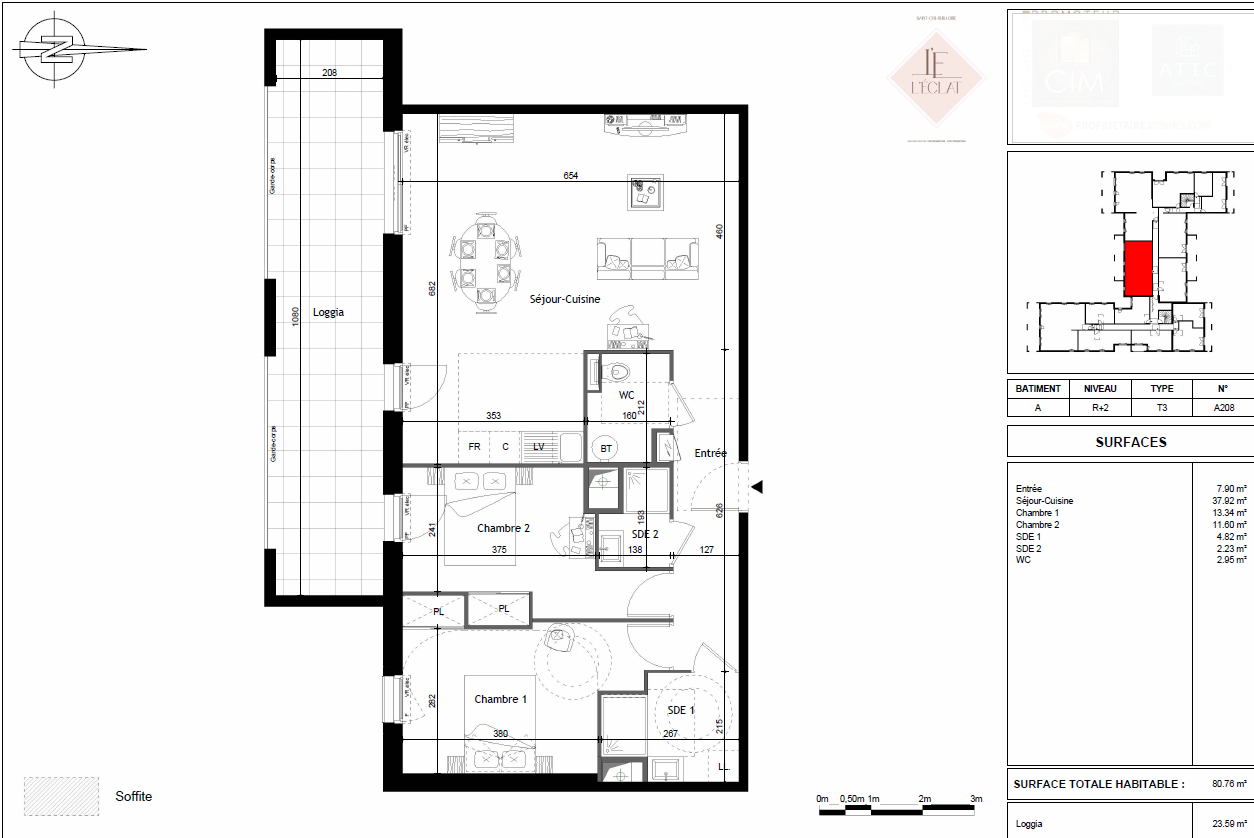 L'appartement de Type4 de 80,76m² avec une Loggia de 23,59 m² et exposé Sud est situé au 2ième étage de la résidence.