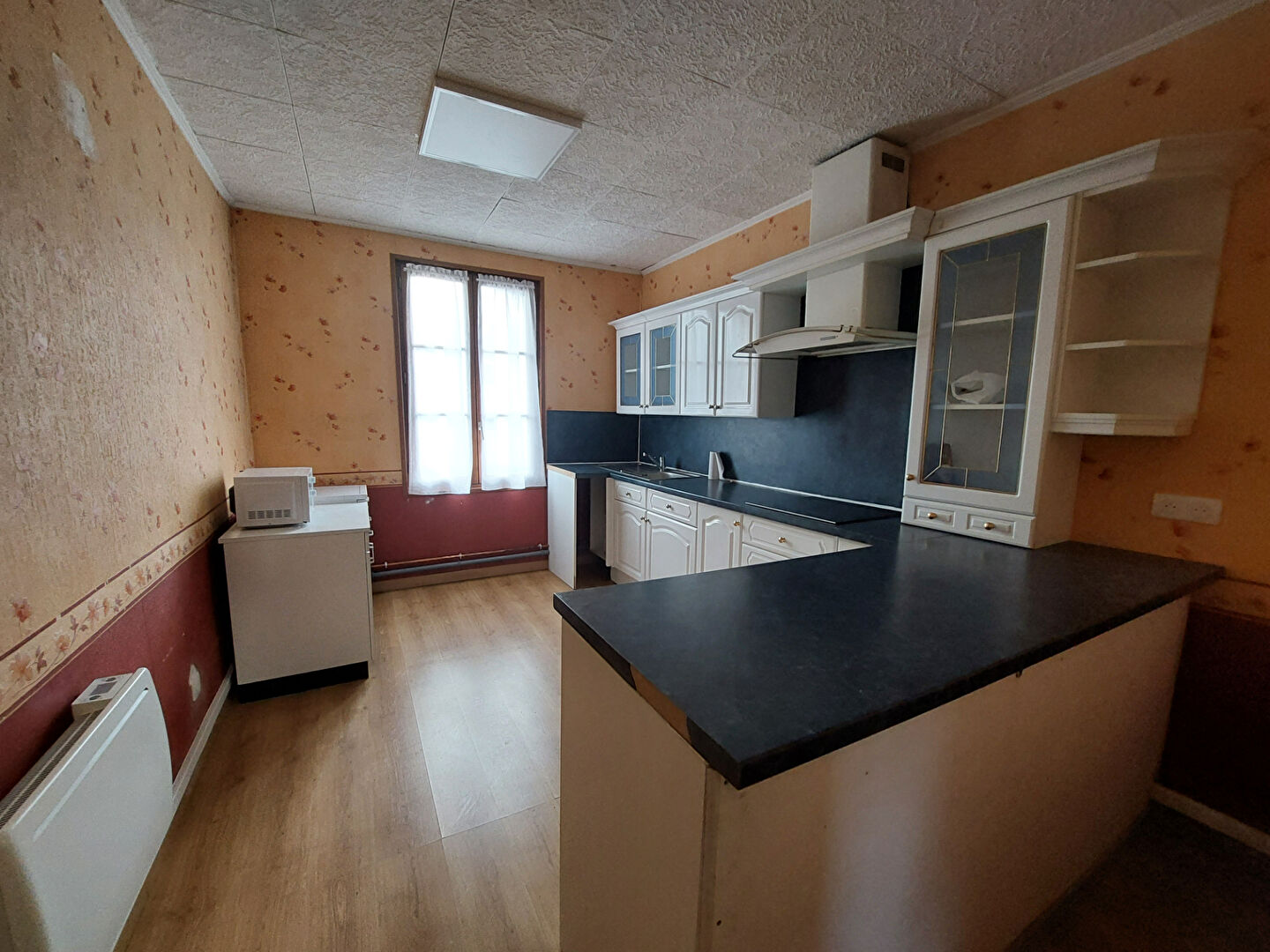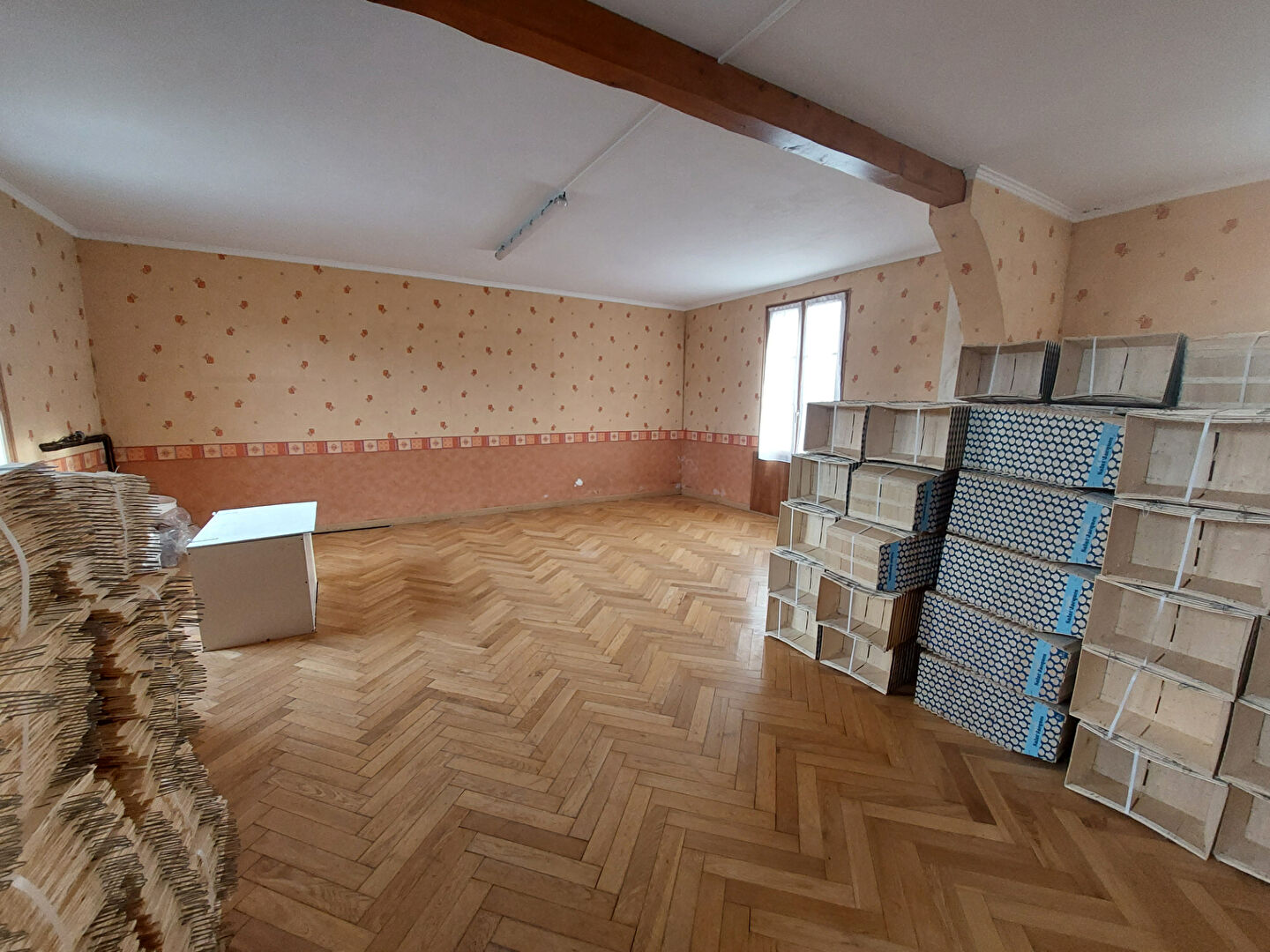 Au 1er étage : un palier dessert un grand espace de vie avec parquet, une cuisine aménagée et deux pièces pouvant servir de bureau et point d'eau