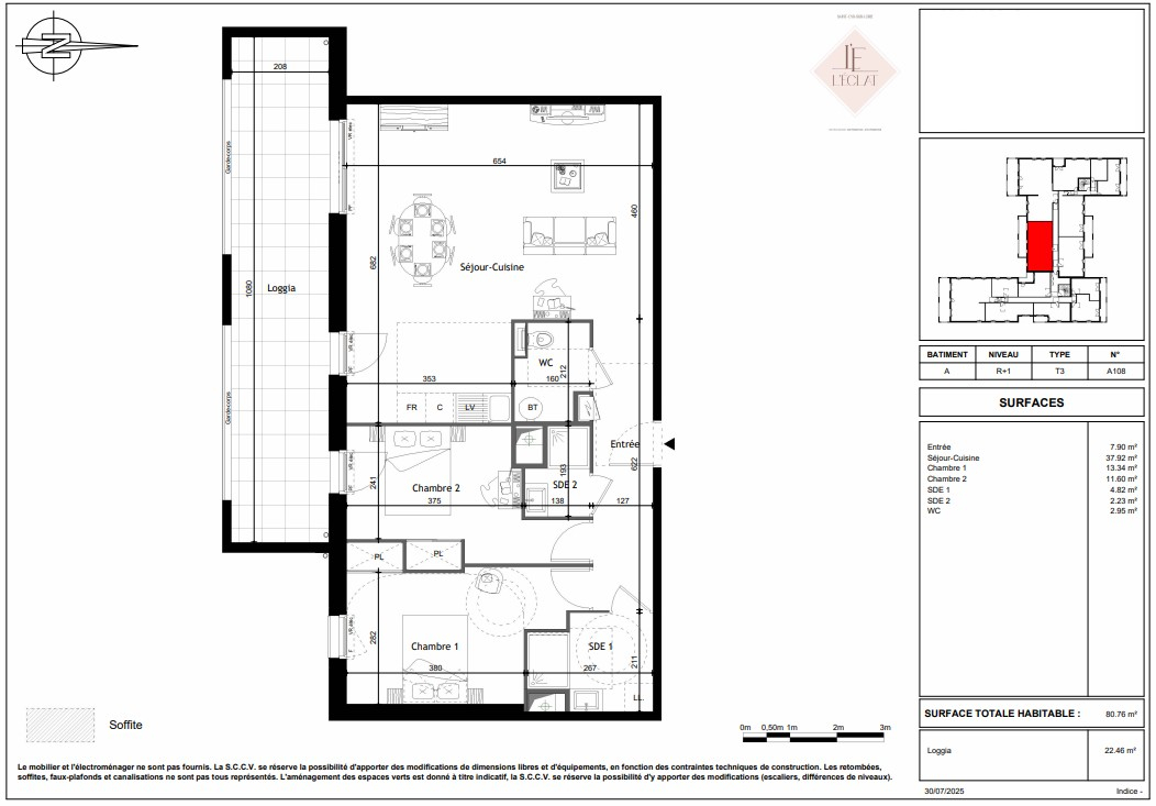 L'appartement de Type4 de 80,76m² avec une Loggia de 22,46 m² et exposé Sud est situé au 1er étage de la résidence.