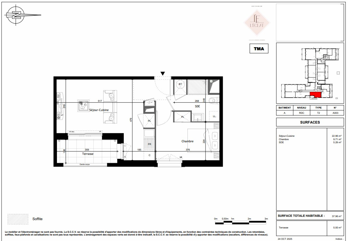 L'appartement de Type2 de 37,96m² avec une Terrasse de 5 m² et exposé Est est situé au Rez-de-chaussée de la résidence.