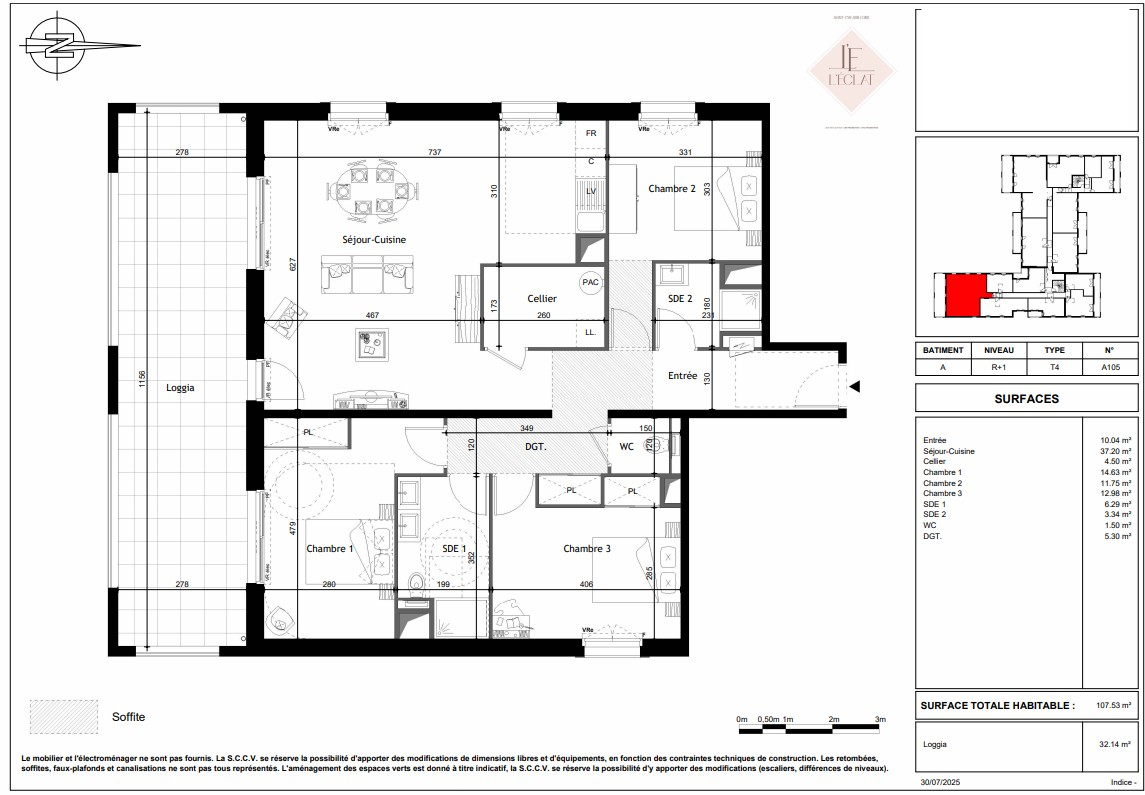 L'appartement de Type4 de 107,53m² avec une Loggia de 32,14 m² et exposé Sud-Est-Ouest est situé au 1er étage de la résidence.