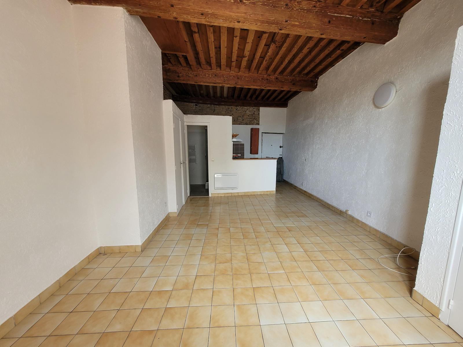 Du charme avec des poutres au plafond, des pierres apparentes, une fenêtre grande hauteur et une belle hauteur sous plafond (lit mezzanine possible).