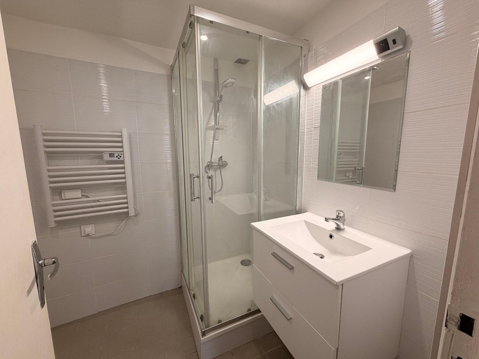 Une grand pièce rectangulaire, facilement aménageable avec son coin cuisine équipée séparée par un meuble bar. La salle de douche a été entièrement renovée en 2024, elle est moderne et fonctionnelle.
