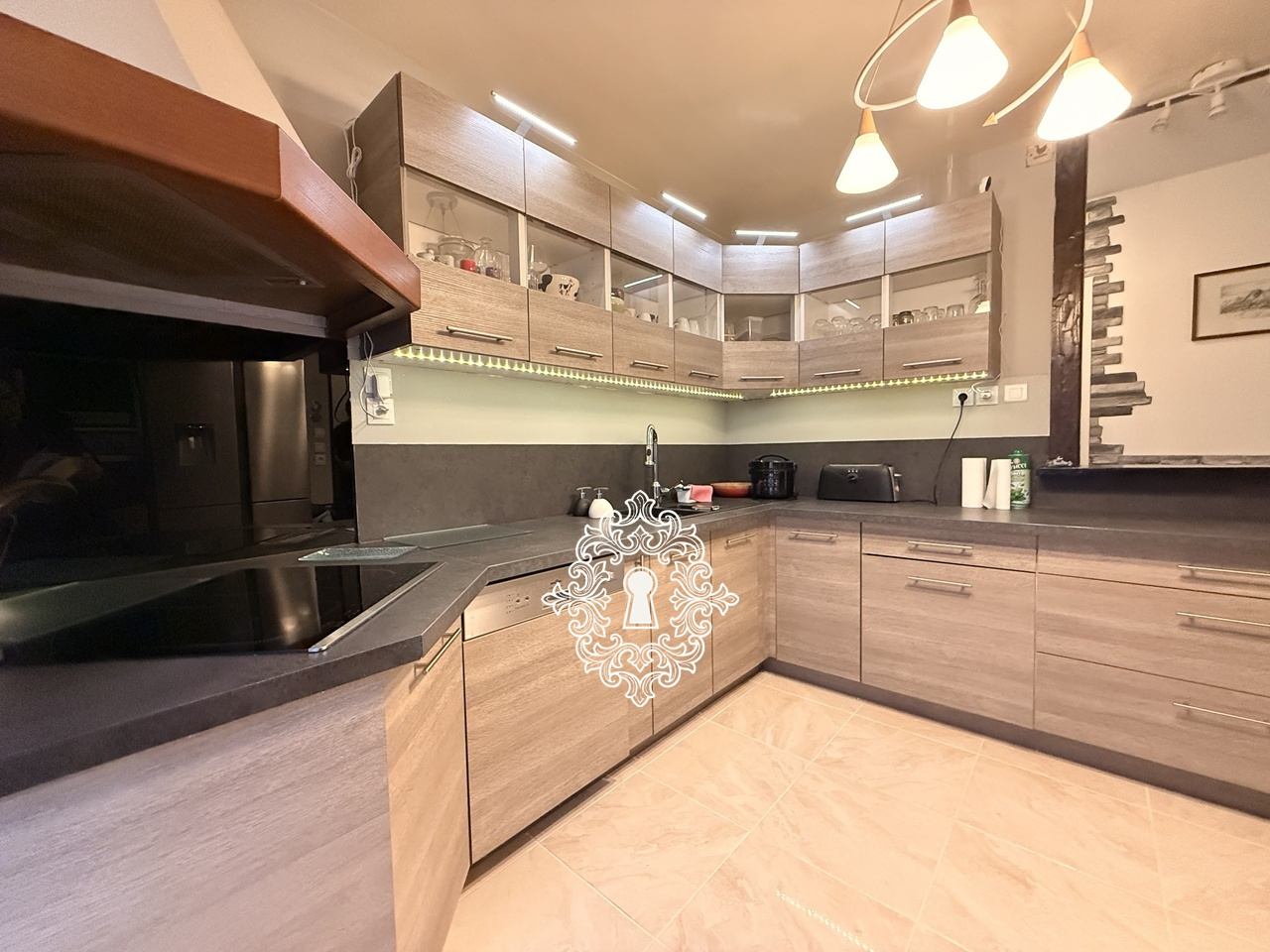entrée, cuisine aménagée et équipée, séjour en partie cathédrale, 3 chambres, salle de bains, wc, grande pièce,