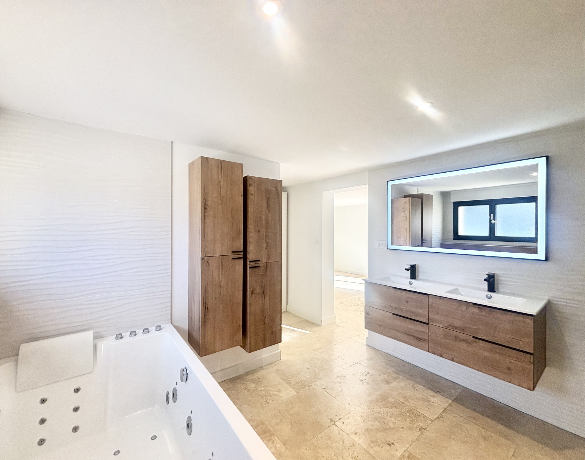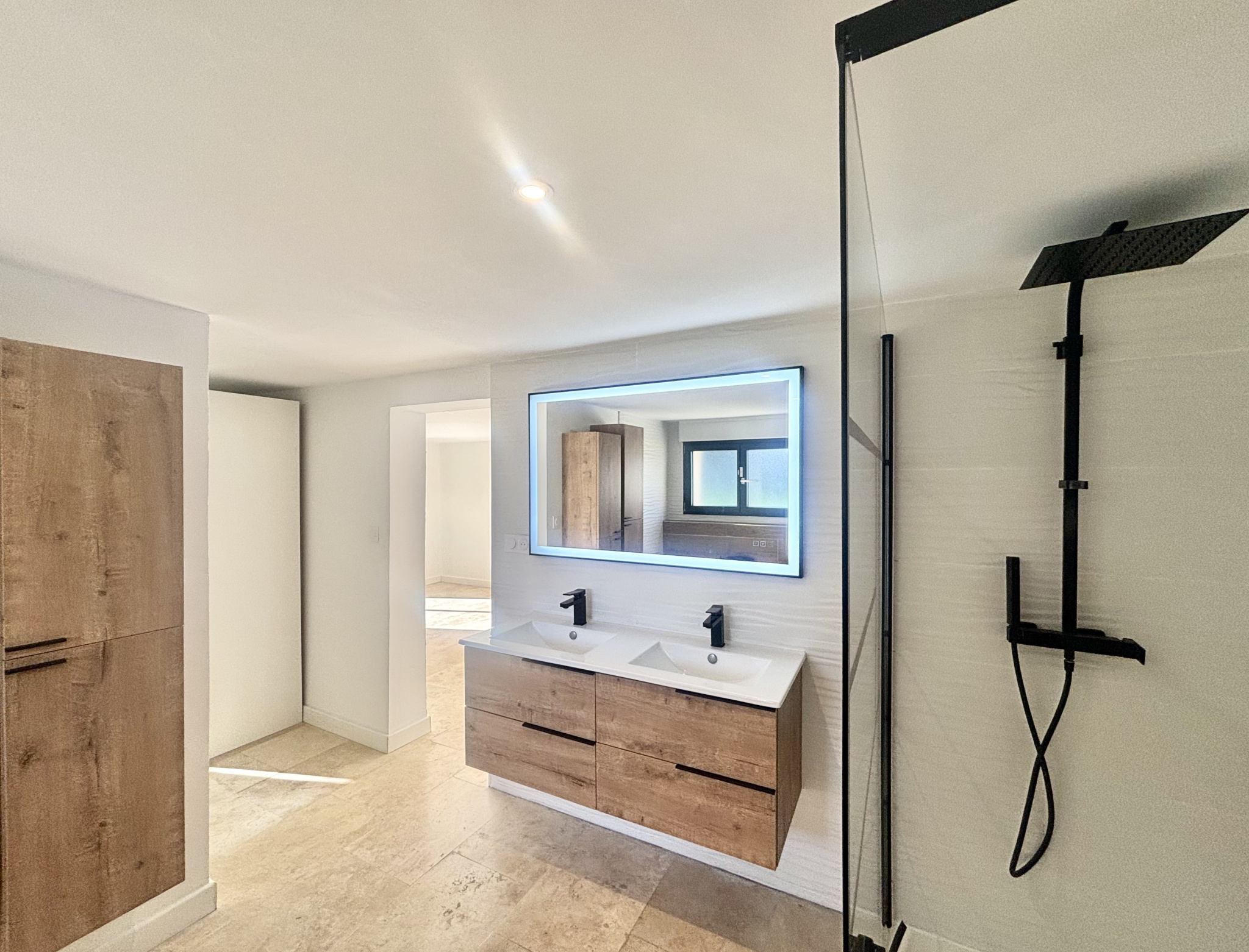 La partie nuit se compose de quatre chambres, dont une suite parentale en rez-de-chaussée avec dressing et salle de bains, ainsi qu'une seconde salle d'eau indépendante, équipée d'une douche à l'italienne.