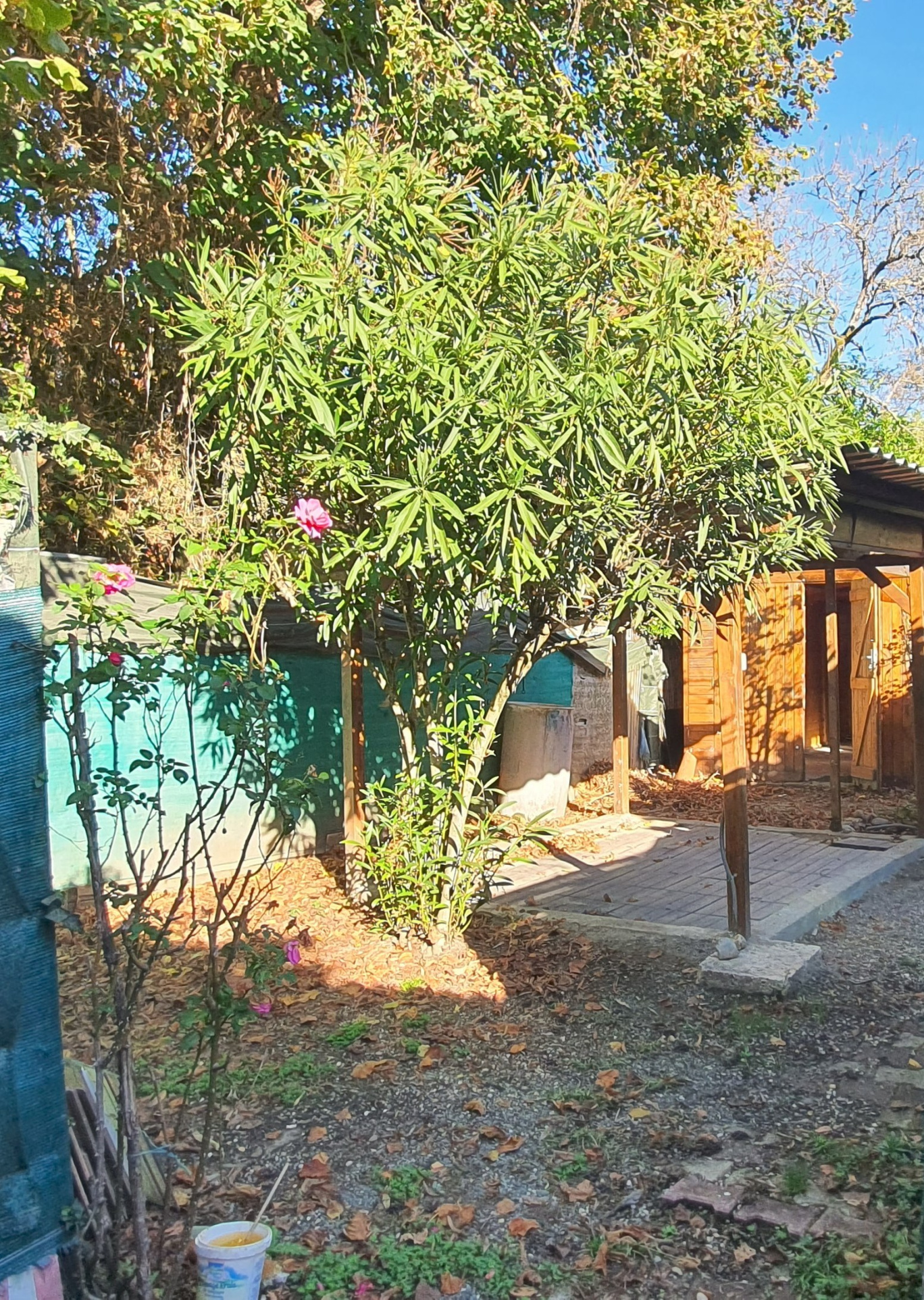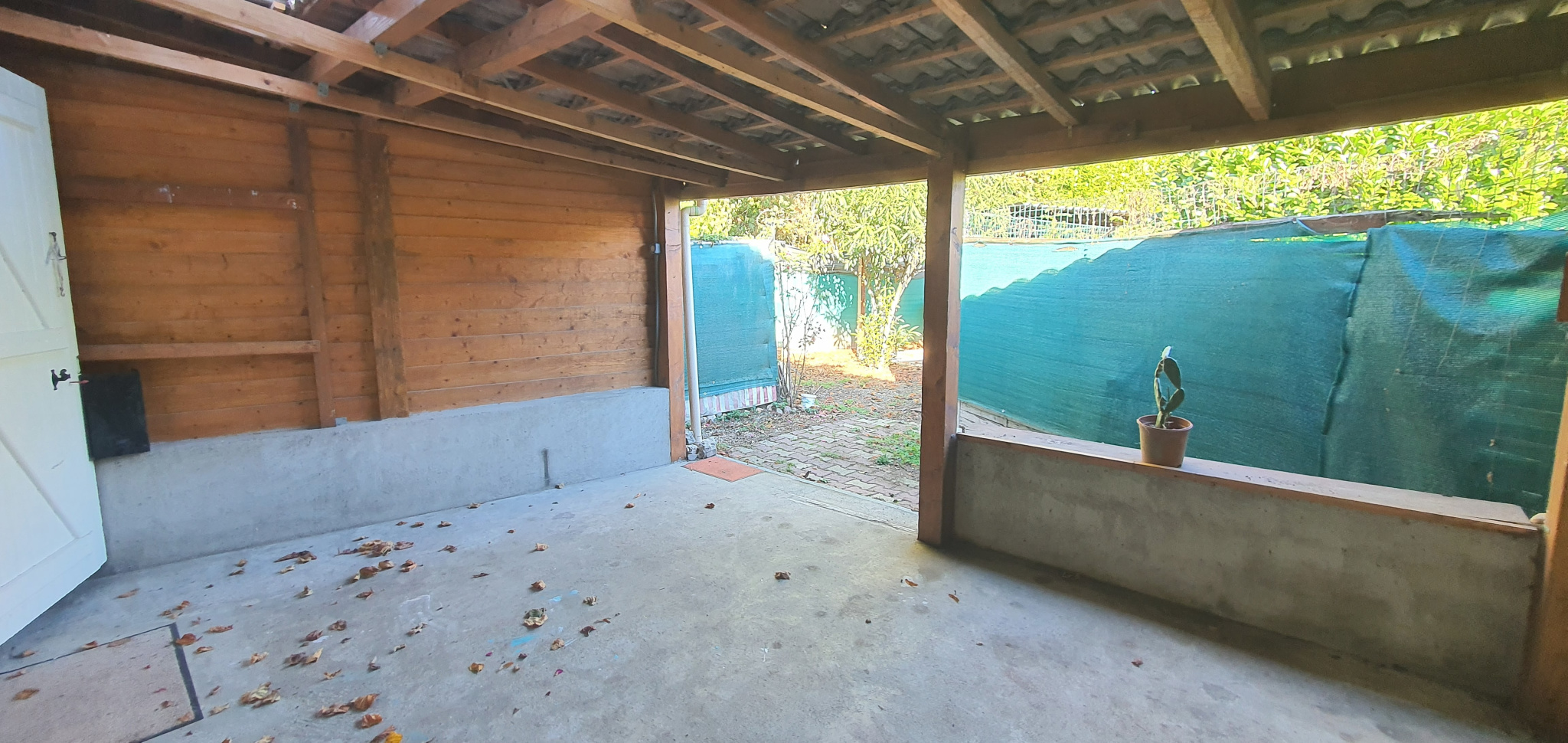 Une terrasse couverte offre un espace de vie supplémentaire aux beaux jours . Elle dessert le jardin et son abris-atelier en bois .