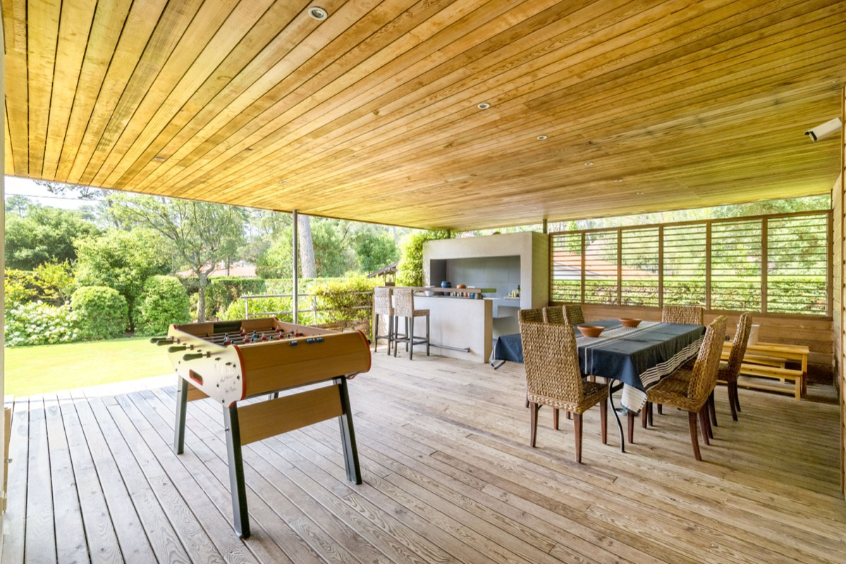 Le jardin paysager accueille une piscine à débordement de 10 × 6 m, chauffée, au sel et sécurisée par un volet immergé, bordée d'une vaste terrasse en bois exotique prolongée par une grande cuisine d'été, idéale pour recevoir dans un cadre privilégié.