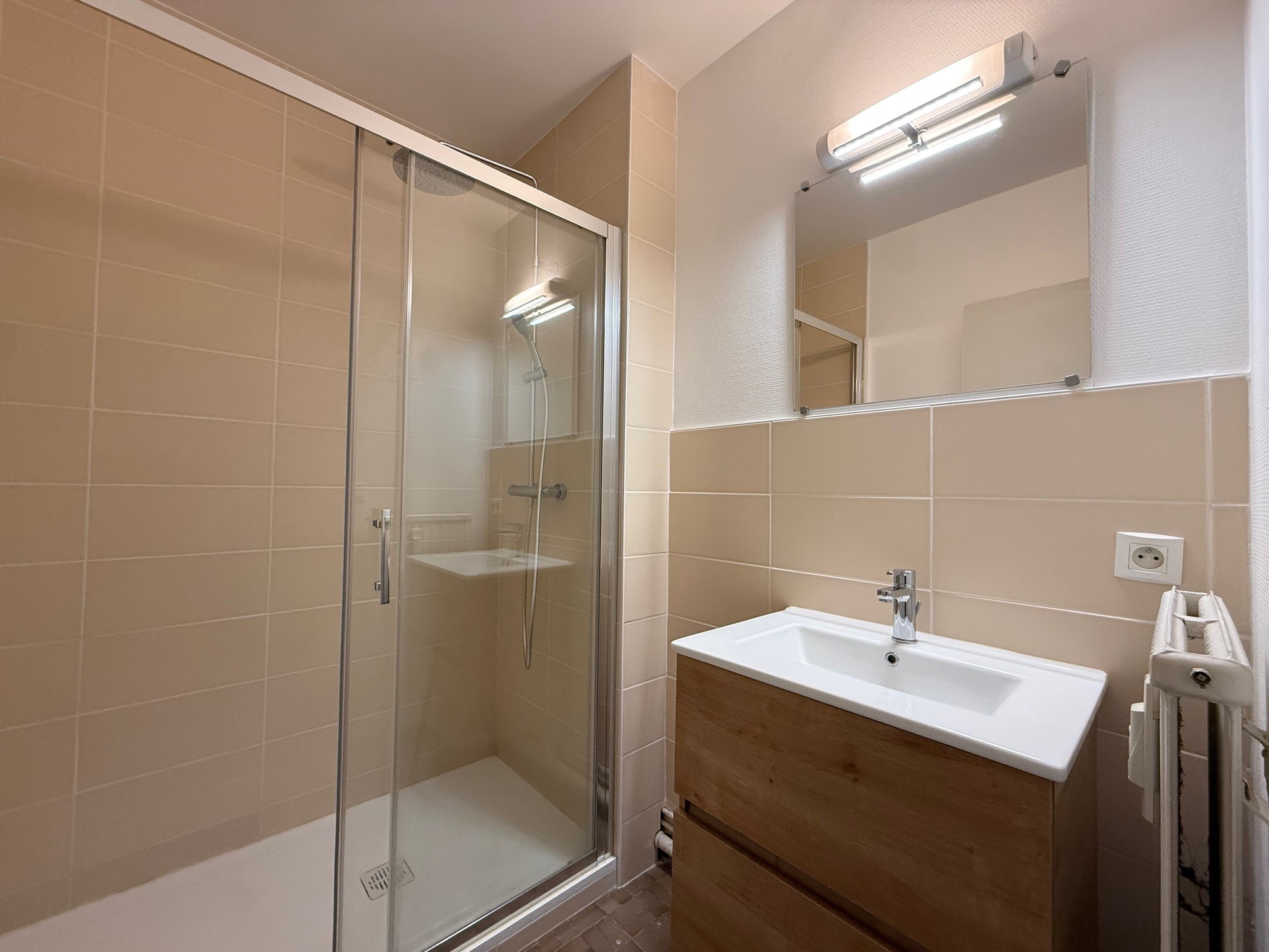 Il se compose d'une entrée avec rangements, d'une double salon/séjour de 25 m2 (possibilité de créer une deuxième chambre d'env. 10 m2 comme sur les photos), d'une cuisine de 13 m2, d'une salle de douche, et d'une chambre de 11 m2.