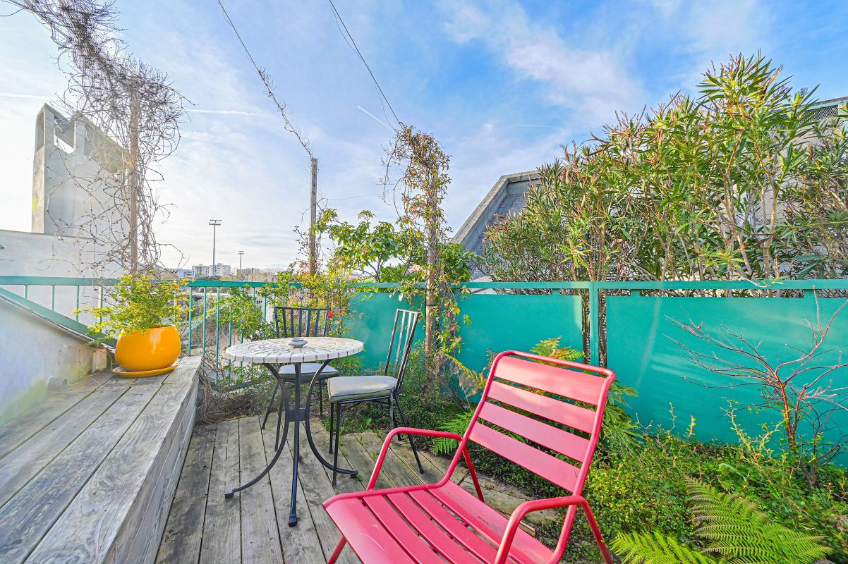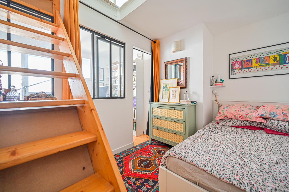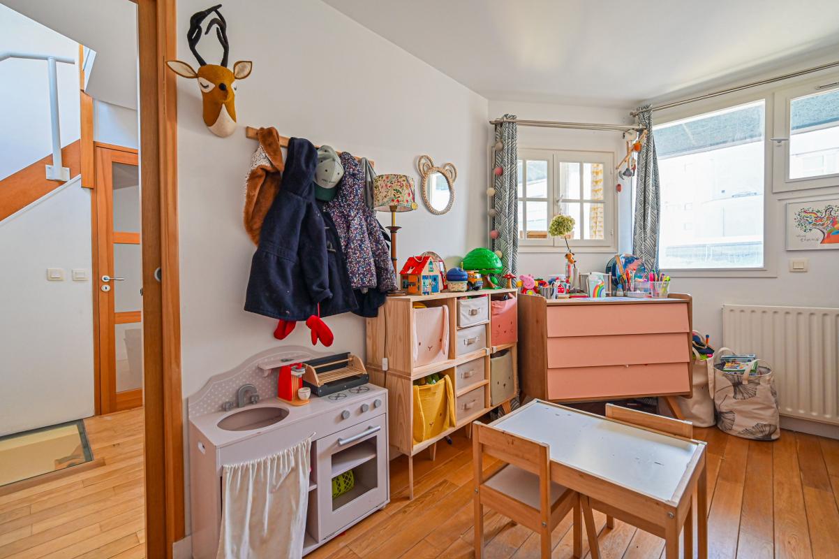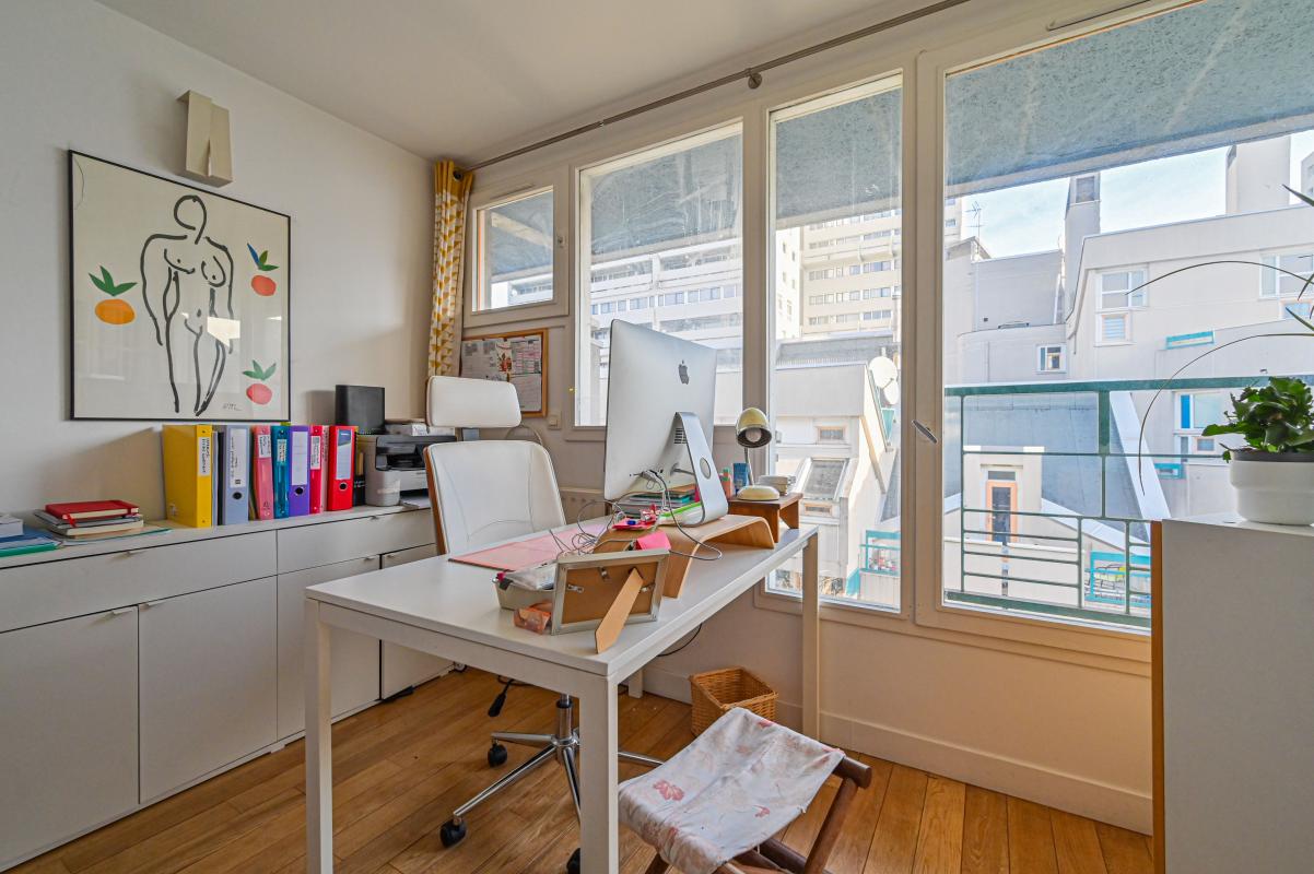 Le premier niveau se compose d'une entrée avec rangements, d'une salle de bain, de WC indépendants, d'une chambre ainsi que d'un bureau. À l'étage inférieur, situé au quatrième étage de l'immeuble, se trouvent une seconde chambre et un bureau. Le dernier niveau, au sixième étage, accueille un séjour avec cuisine équipée ouvrant directement sur une terrasse de 14m2 exposée plein sud-ouest, idéale pour profiter d'un ensoleillement optimal tout au long de la journée.