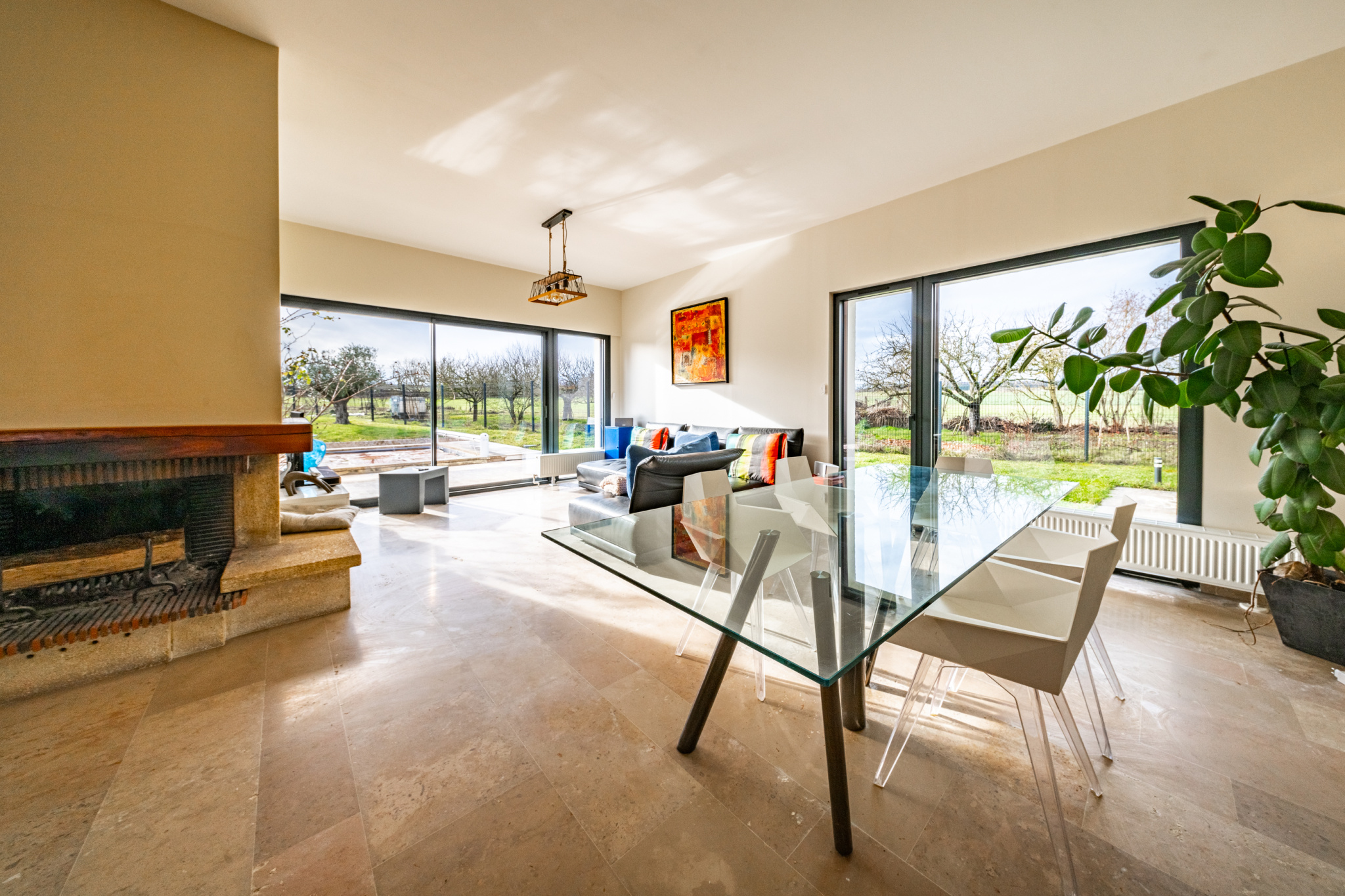 La cuisine Schmitt, moderne et entièrement équipée, est ouverte sur une vaste pièce de vie de 69 m2. Cet espace convivial bénéficie de larges ouvertures donnant directement sur la terrasse, la piscine et les champs environnants, avec une vue totalement dégagée sur la nature.