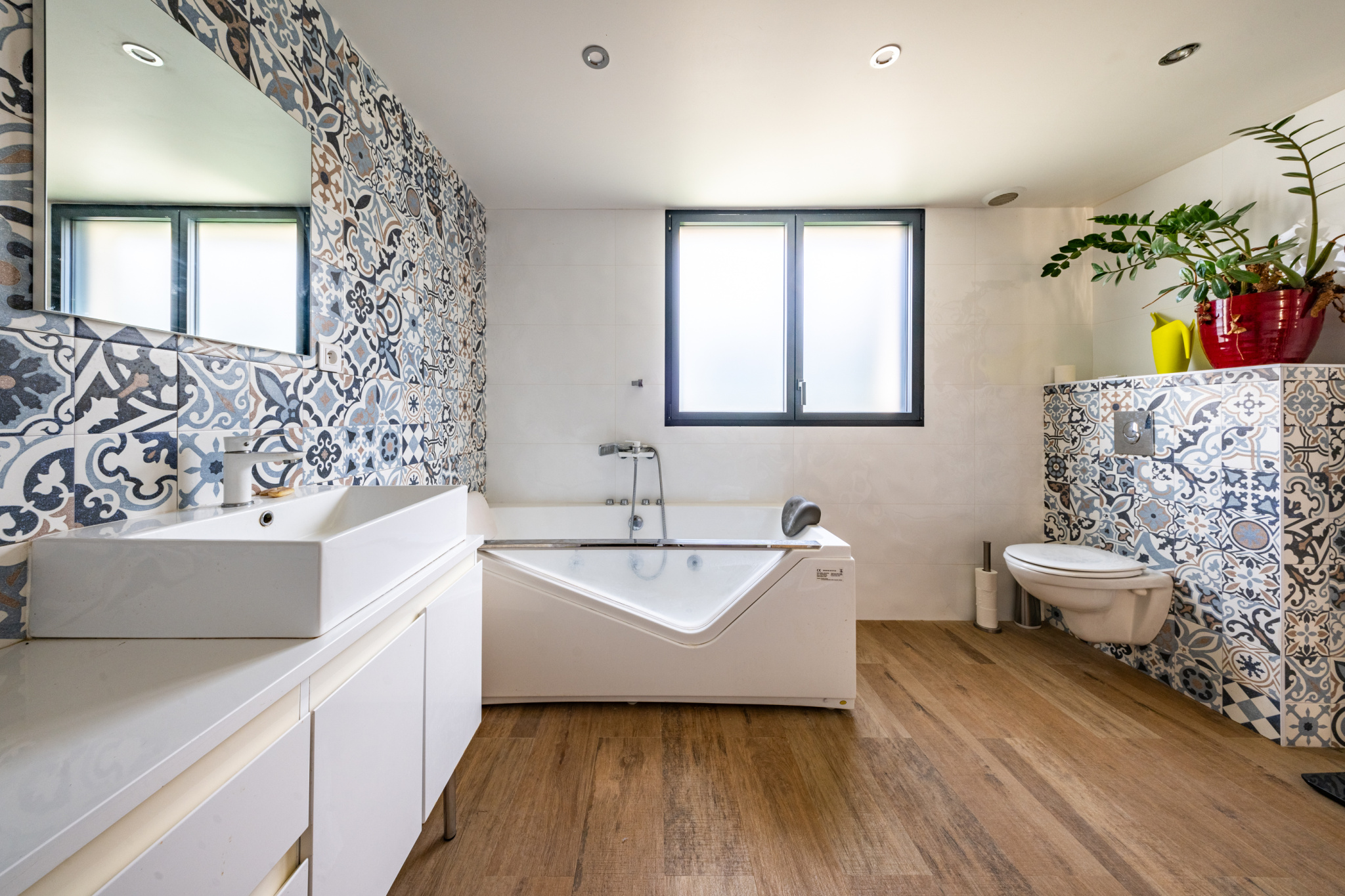 La partie nuit se compose de quatre chambres, d'une salle d'eau et d'une grande salle de bains avec dressing, offrant un agencement fonctionnel et confortable pour une famille.