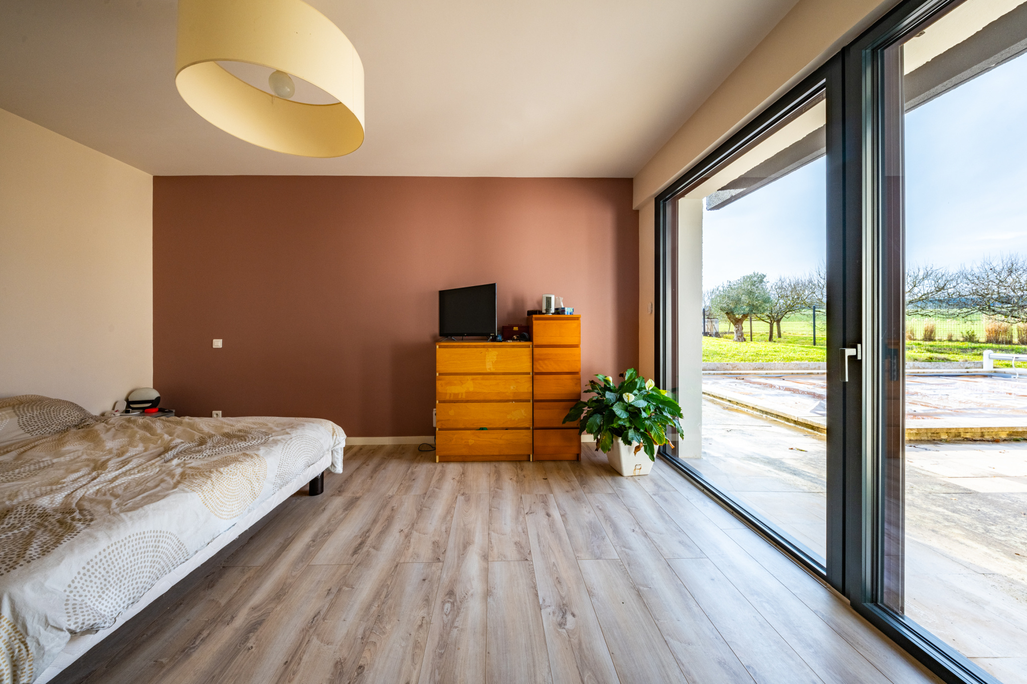 À l'extérieur, une grande terrasse permet de profiter des beaux jours, avec un barbecue intégré et un espace détente autour de la piscine.