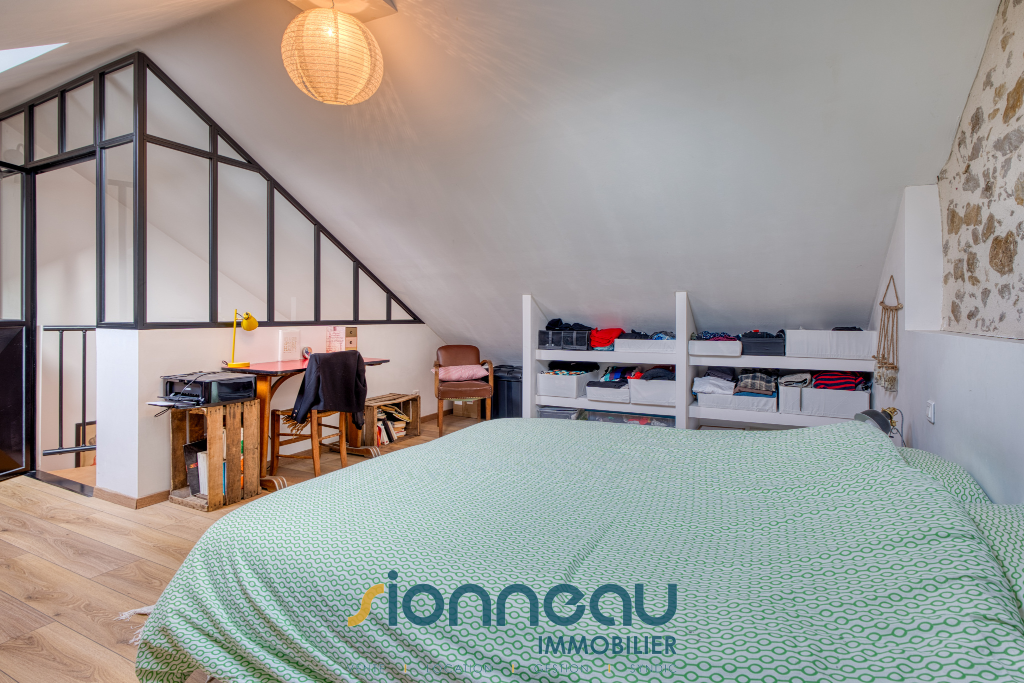 À l'étage supérieur, une chambre mansardée offre un cocon intimiste.