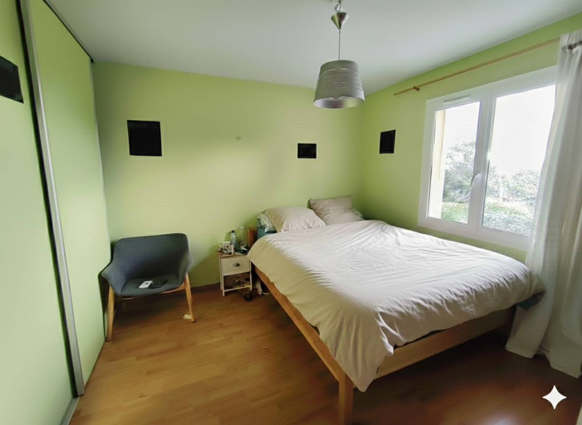 Maison individuelle de 165m2 construite en 2001, implantée sur un terrain entièrement clos de 1 867 m2. L'entrée dessert un dégagement avec placard et un WC séparé. L'espace de vie se compose d'un salon chaleureux avec poêle à bois et d'une cuisine ouverte meublée et entièrement équipée. Un demi niveau accueille une salle de bain avec douche et baignoire, double vasque et sèche serviette électrique, ainsi que trois chambres de 13m2, 13m2 et 11m2, toutes équipées de placards et de parquet flottant.